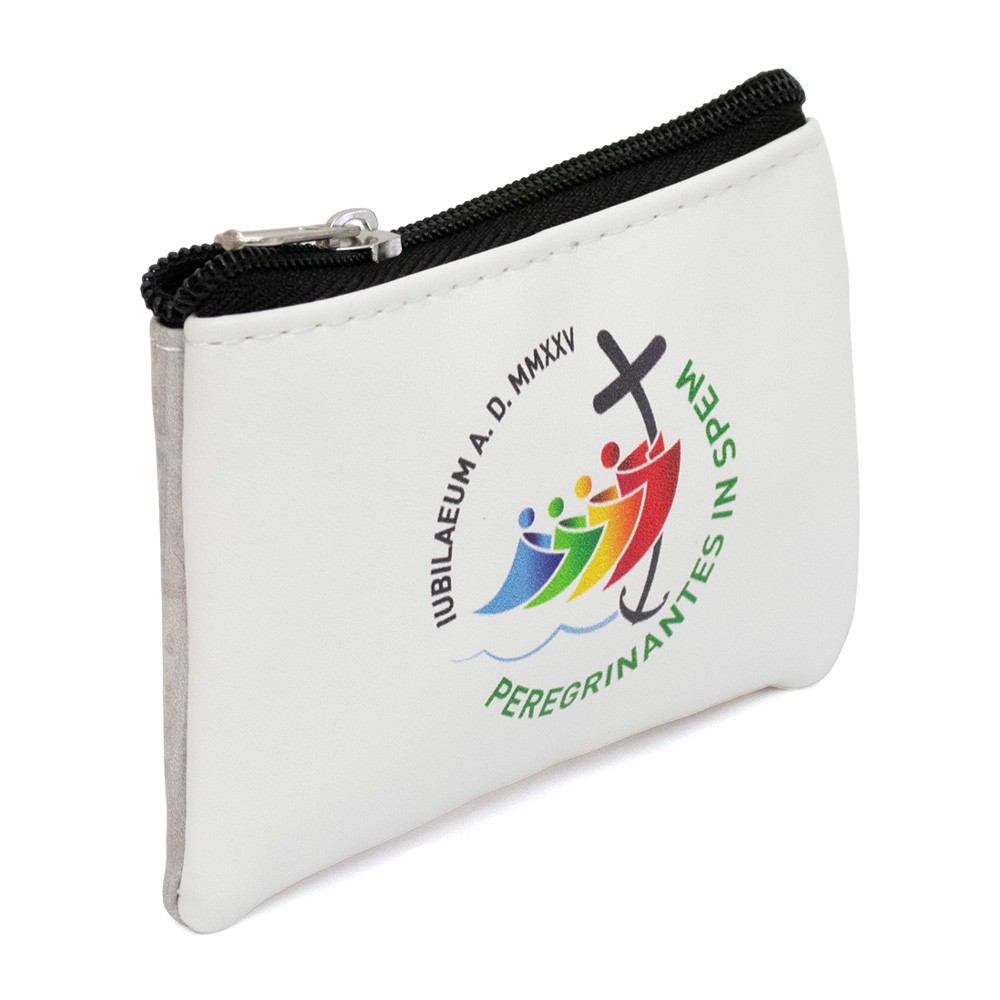 This Jubilee rosary case features a white leatherette exterior with a zipper and the official Jubilee Pilgrims of Hope 2025 logo on the front.