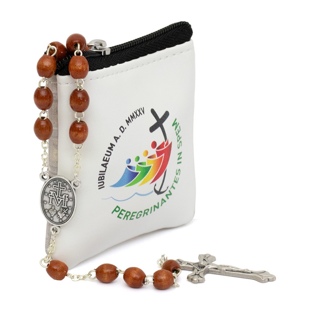 Mini rosary case with zipper, made from white leatherette, featuring the official logo of Jubilee Pilgrims of Hope 2025.