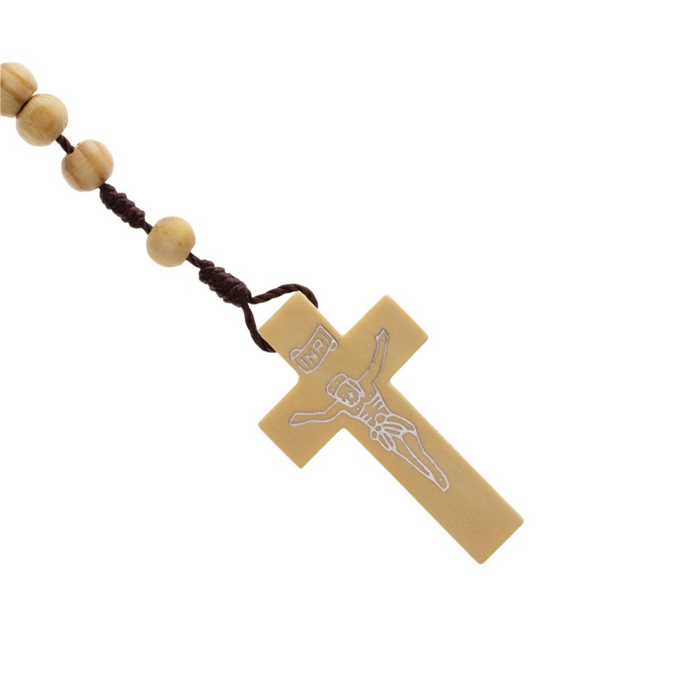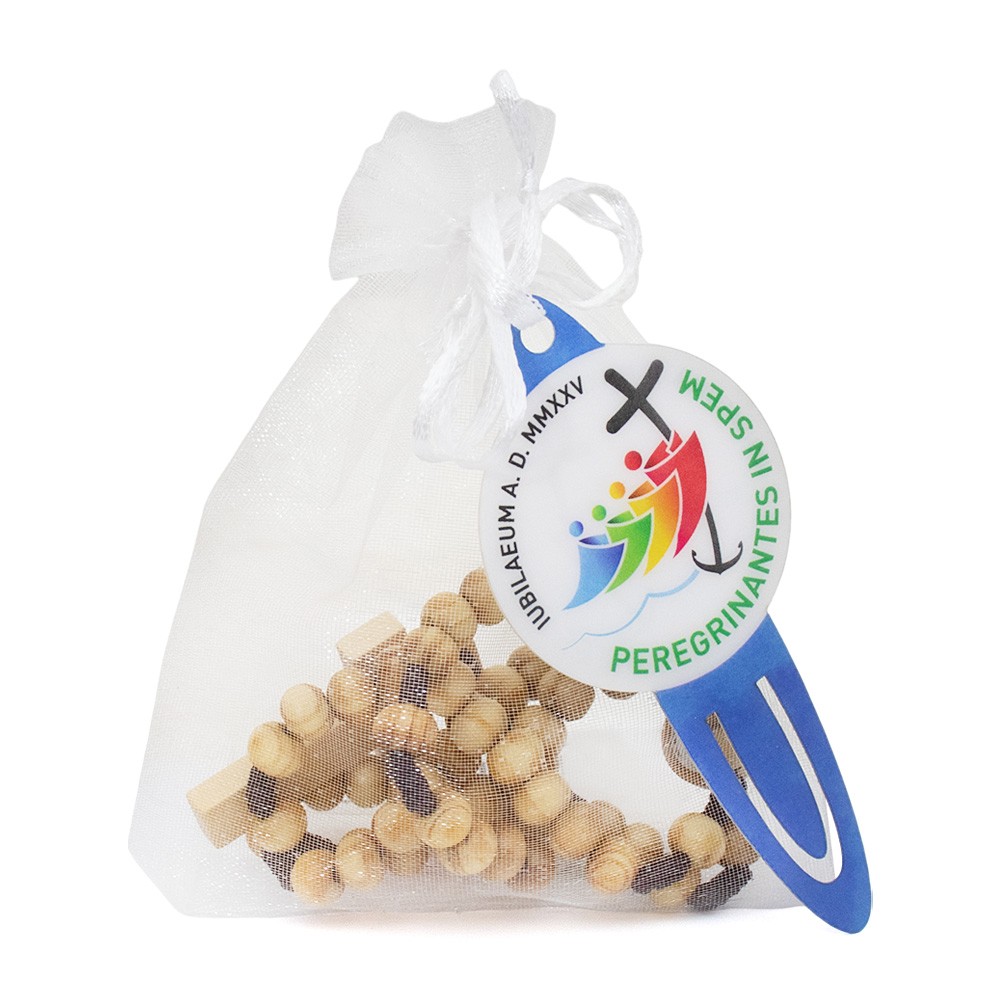 This rosary features round wooden beads (Ø 4 mm) strung on brown cord, with a centerpiece adorned with the Jubilee logo and a light wood cross. The laminated bookmark includes the Jubilee logo, all packaged in a practical tulle bag.