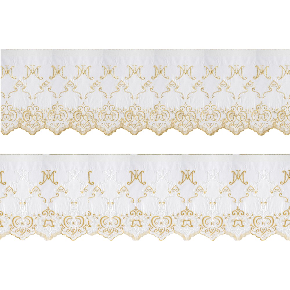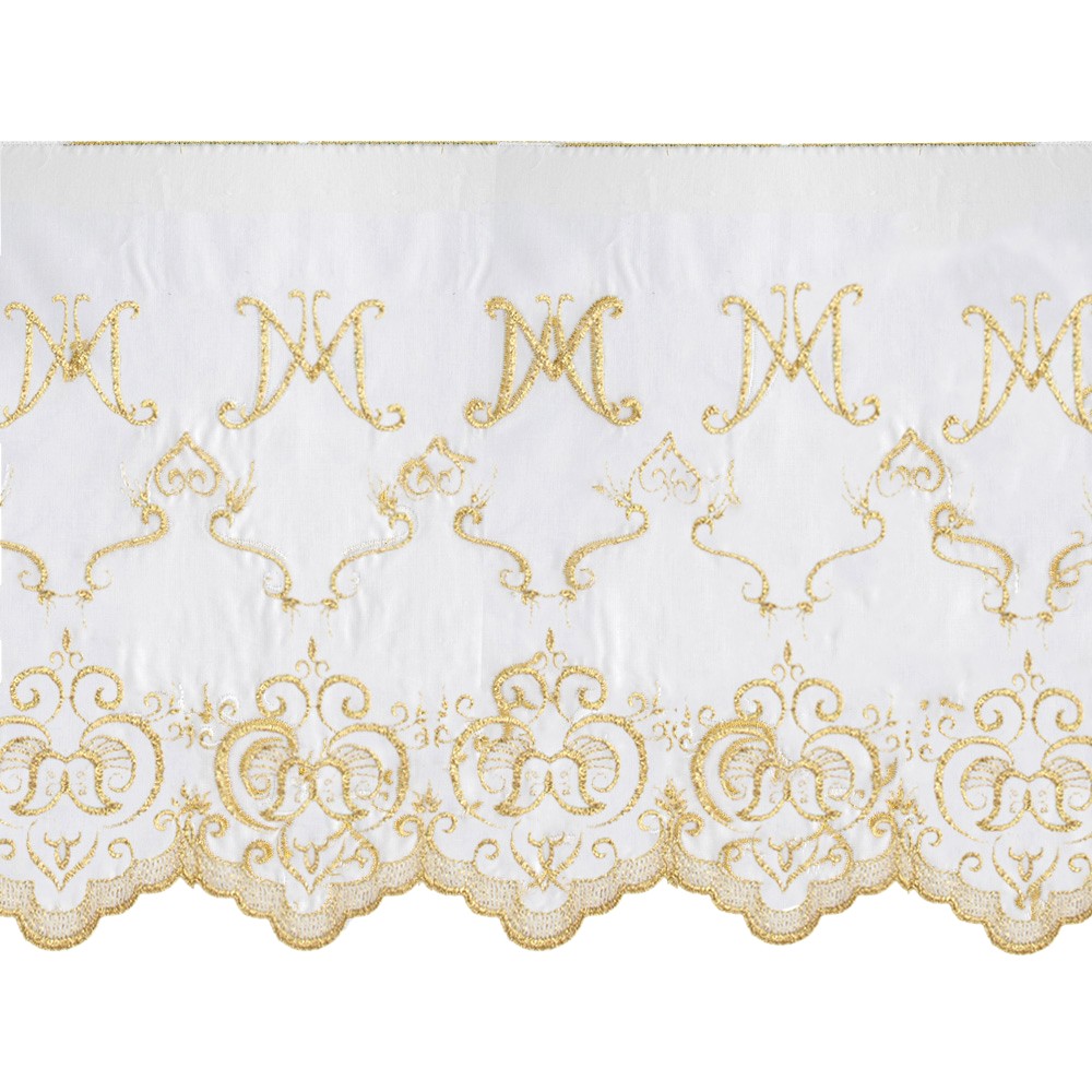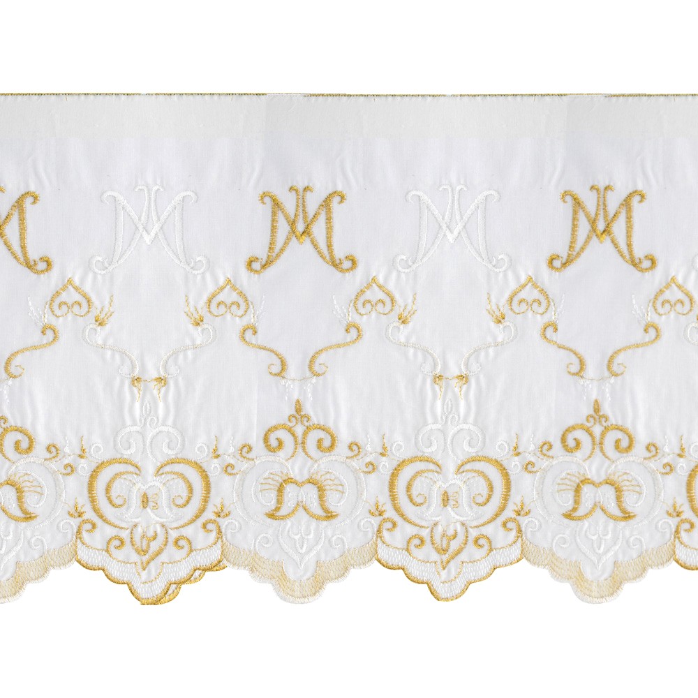 Border trim for altar cloth with embroidery depicting the Marian symbol. The embroidery is available in gold or white and gold.