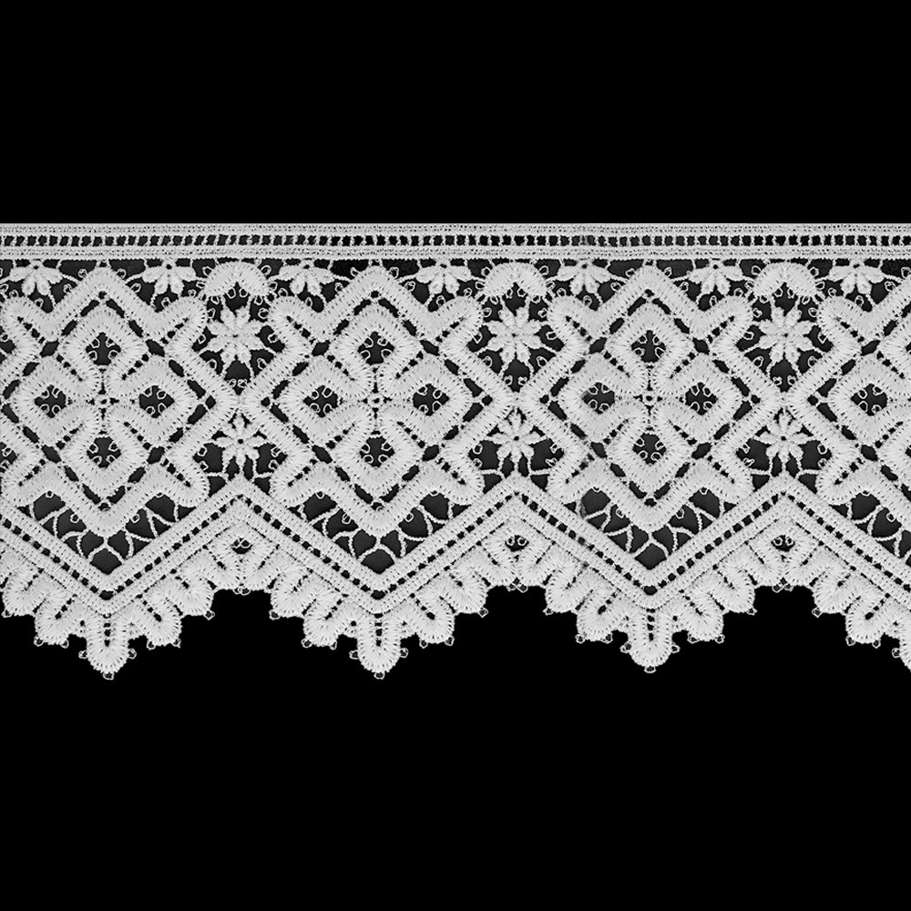 White lace trim made of macramè with scalloped embroidery of crown. Height: 3.5 cm.