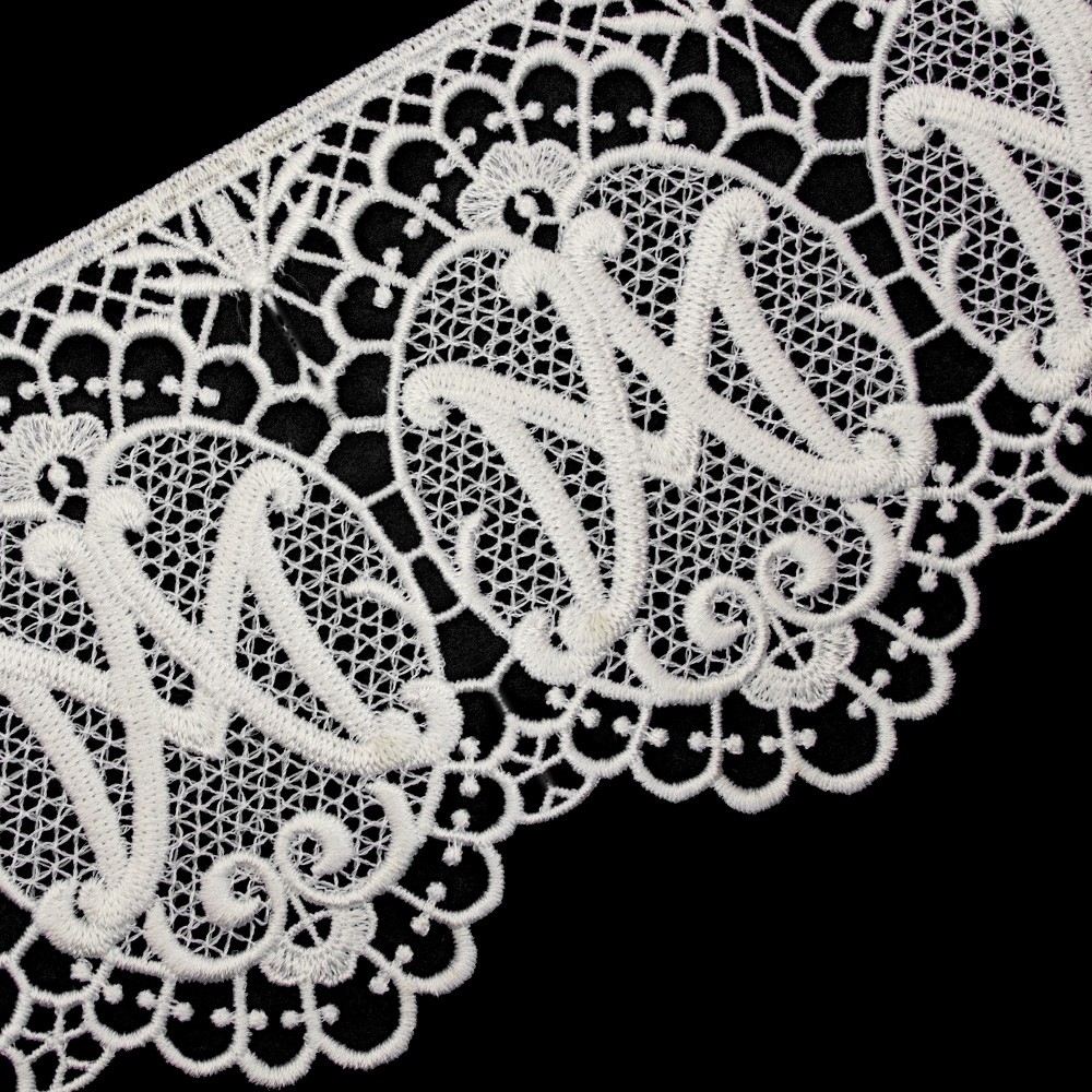 White lace trim made of macramè with scalloped embroidery of crown. Height: 3.5 cm.