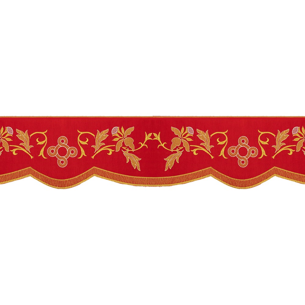 Red border trim ideal for altar cloths, made of faille fabric blend of polyester and wool.