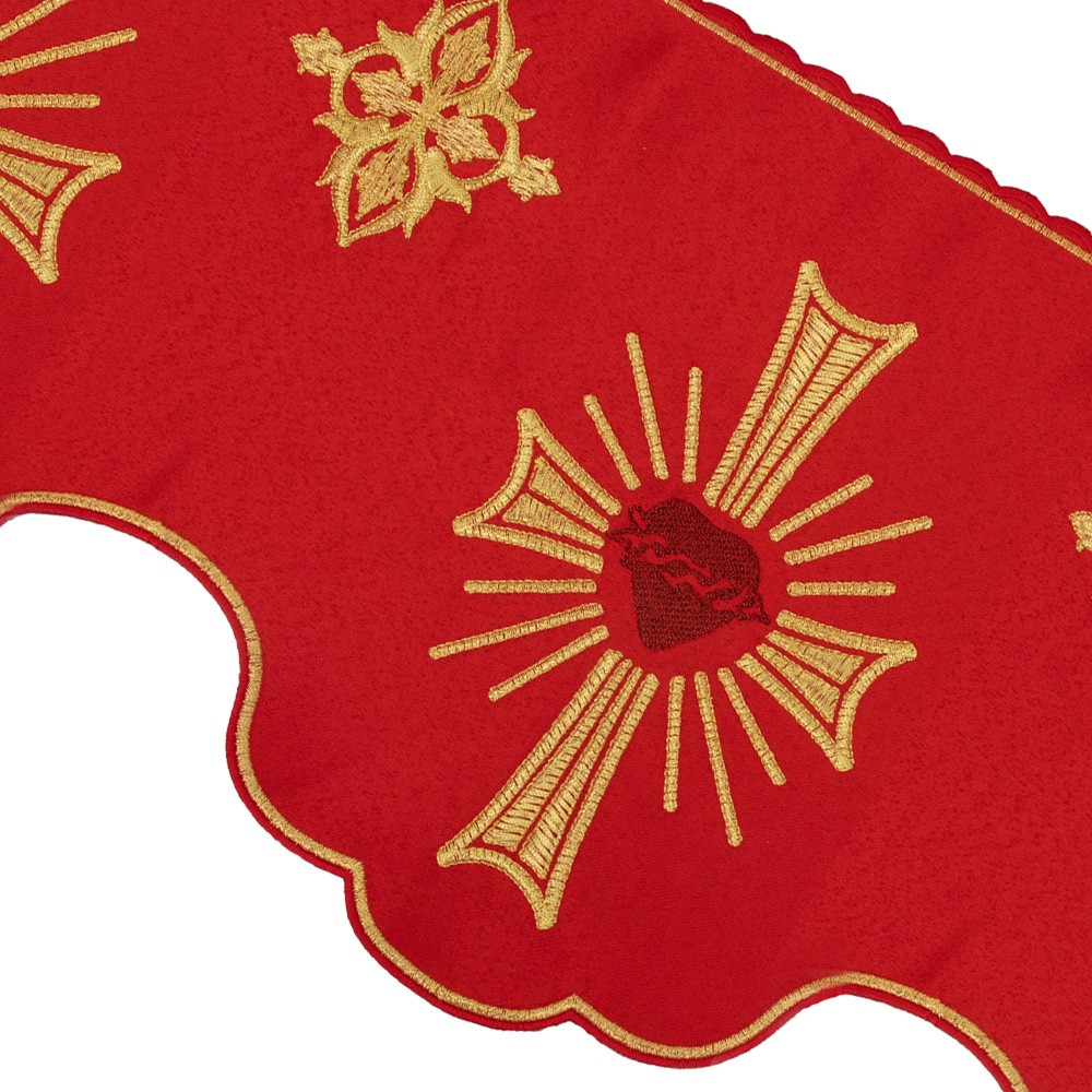 This border trim is 24 cm tall and features lovely decorations depicting a cross with rays and the Sacred Heart of Jesus in the middle. The embroideries are finely made by machine using golden and red yarn.