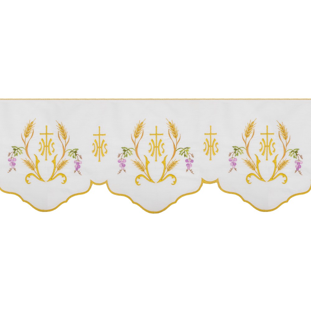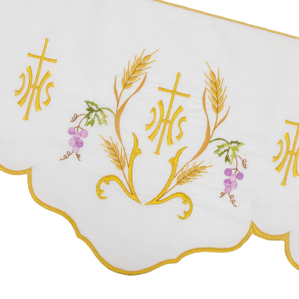 This border features fine machine embroideries depicting crosses, ears of wheat, bunch of grapes and JHS symbol.