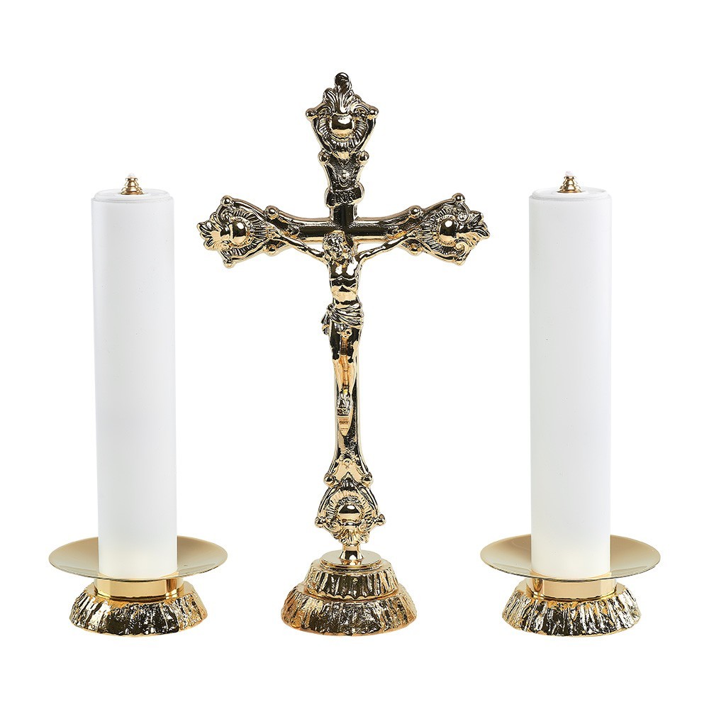 Complete altar set with three pieces. Complete altar cross with two matching candle holders in gold cast brass. The pair of candle holders is complete with candles and containers. Produced by an Italian company using the finest materials.