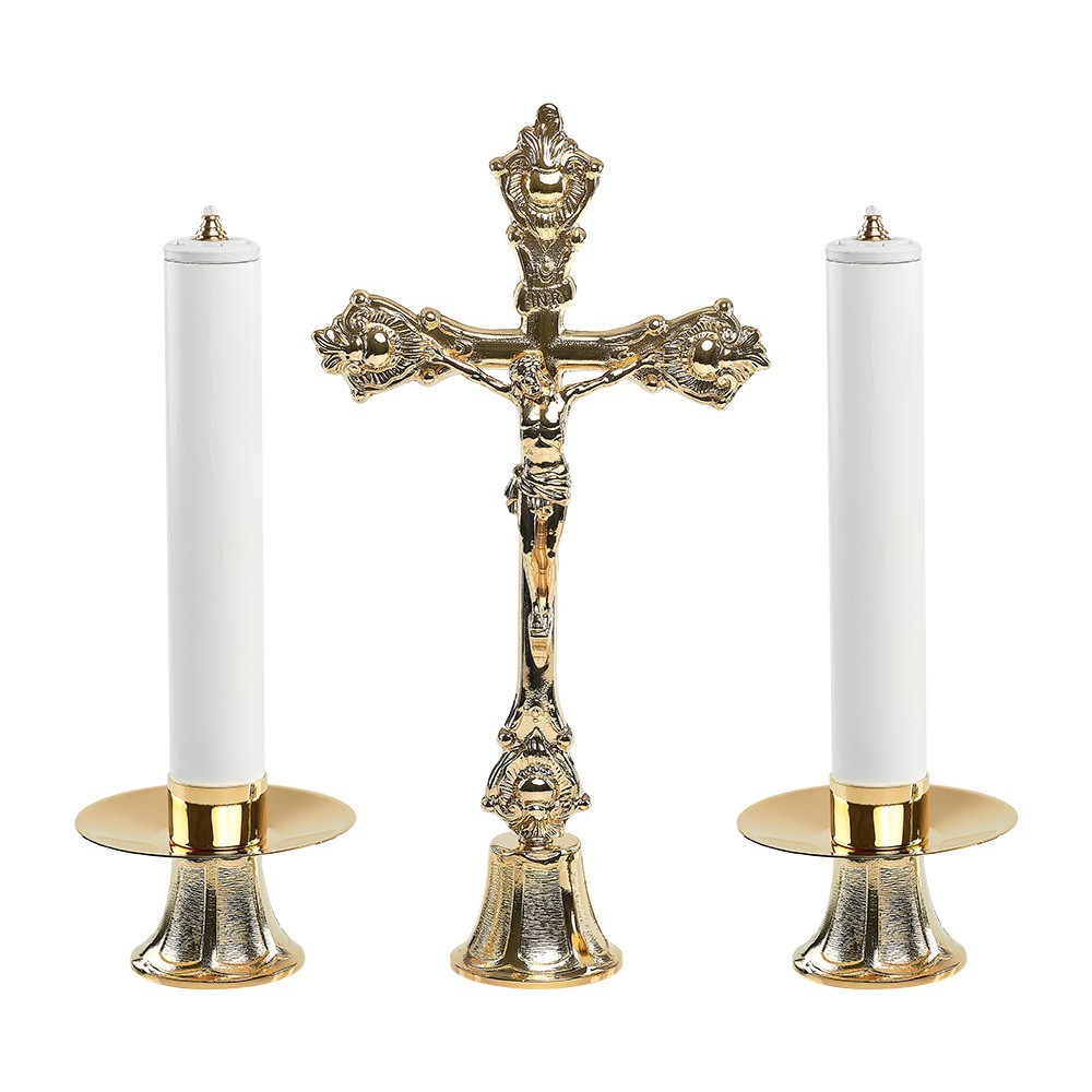 Complete altar set with cross, two candle holders and fake candles. This elegant altar set is made of brass with gold casting.