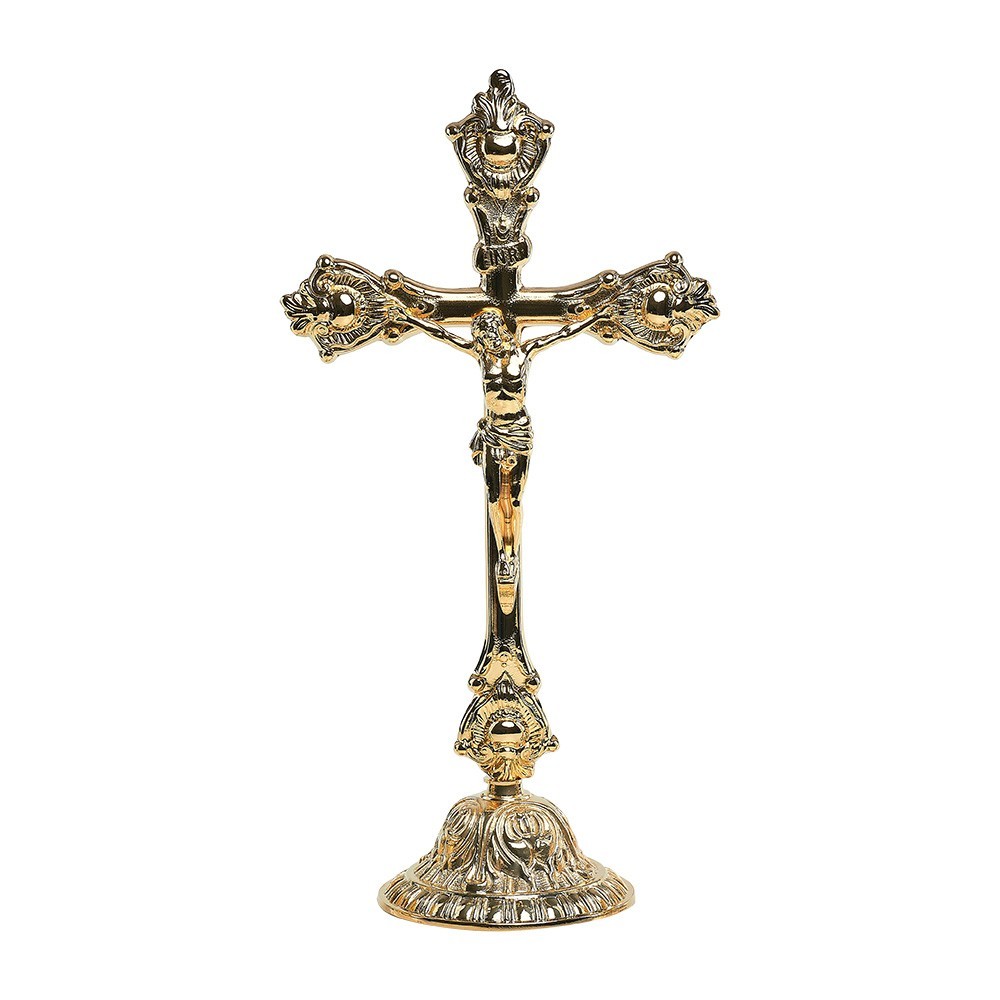 Cross mounted on a base, made of brass with gold finish. This altar crucifix is 36 cm tall and is finely decored.