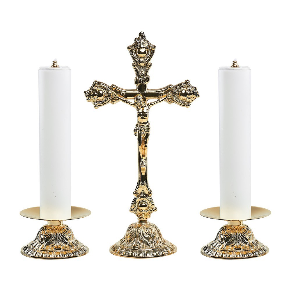 This set is composed of an altar cross, two candle holders, fake candles and containers. Entirely made of golden brass. The cross is 36 cm tall. The total height of a candle holder is 25 cm and its diameter is 5.5 cm. Made in Italy.