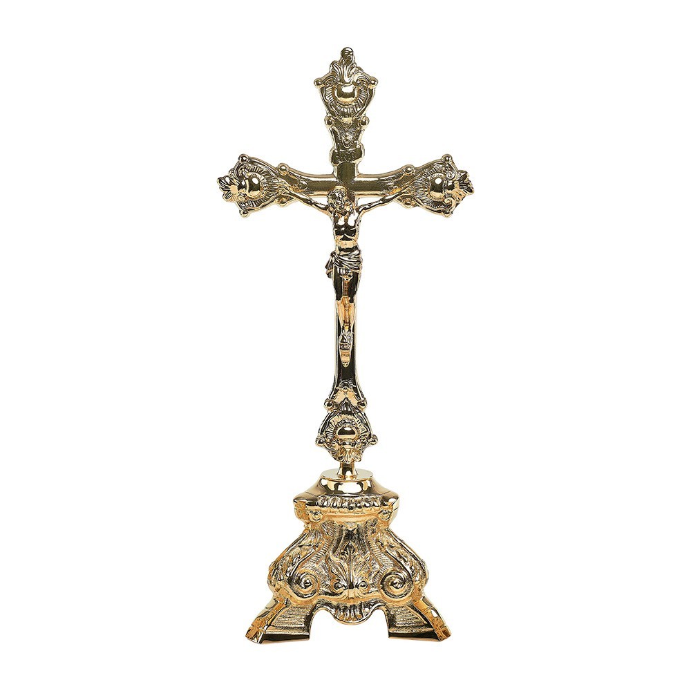 Altar cross in baroque style, h 45 cm. Entirely made of golden brass. Premium quality product, entirely made by a skilled Italian company with great attention to detail.