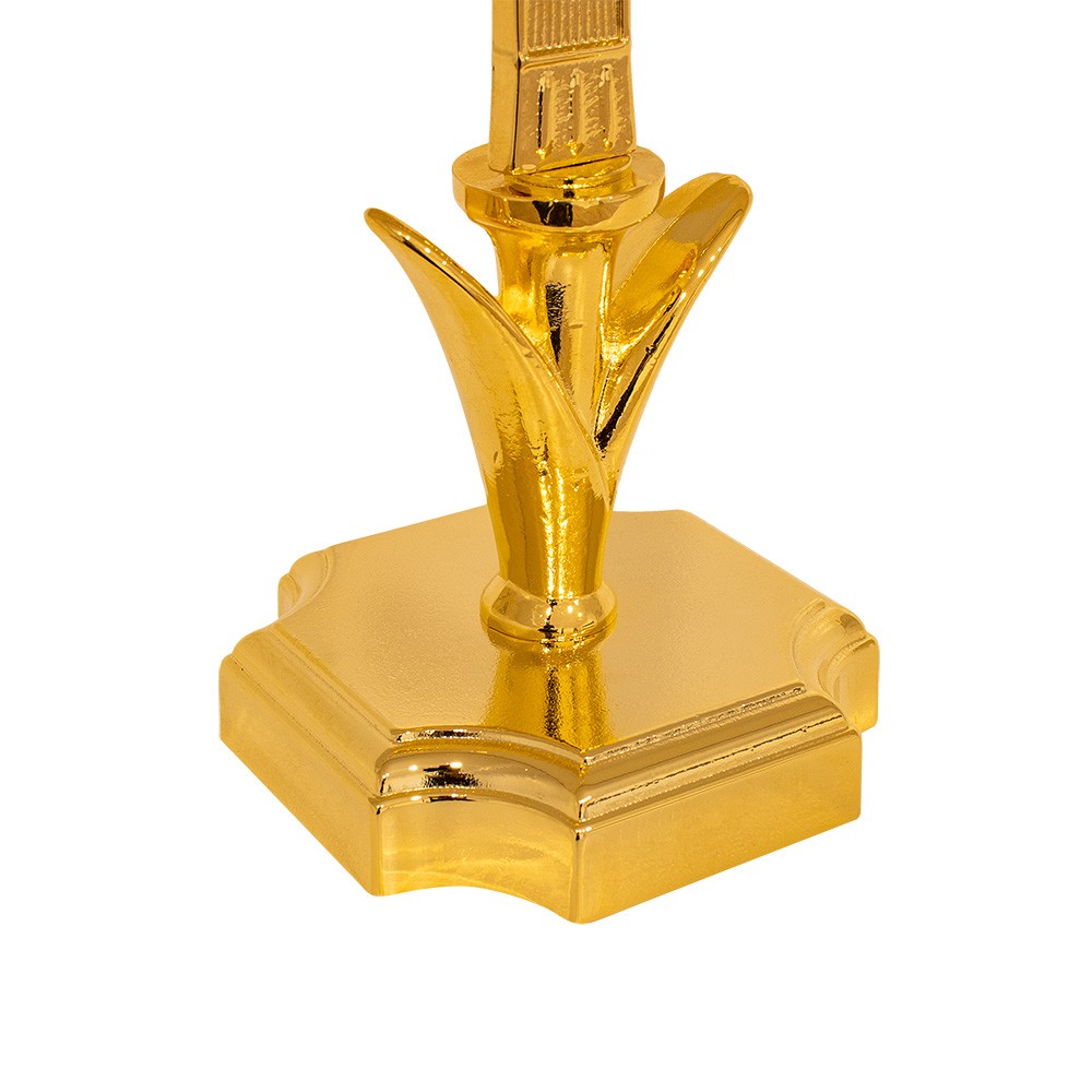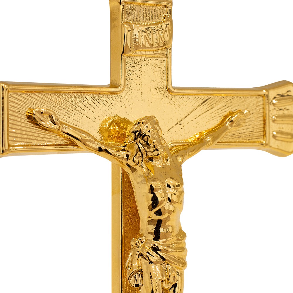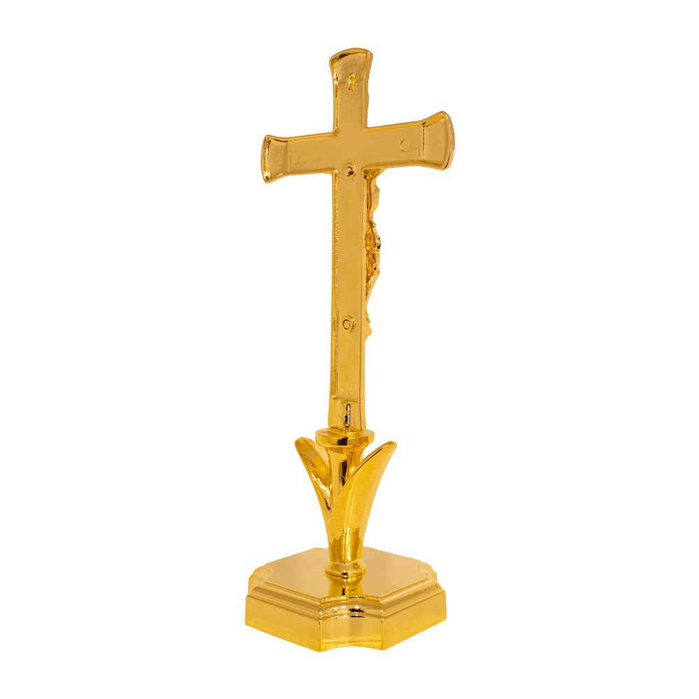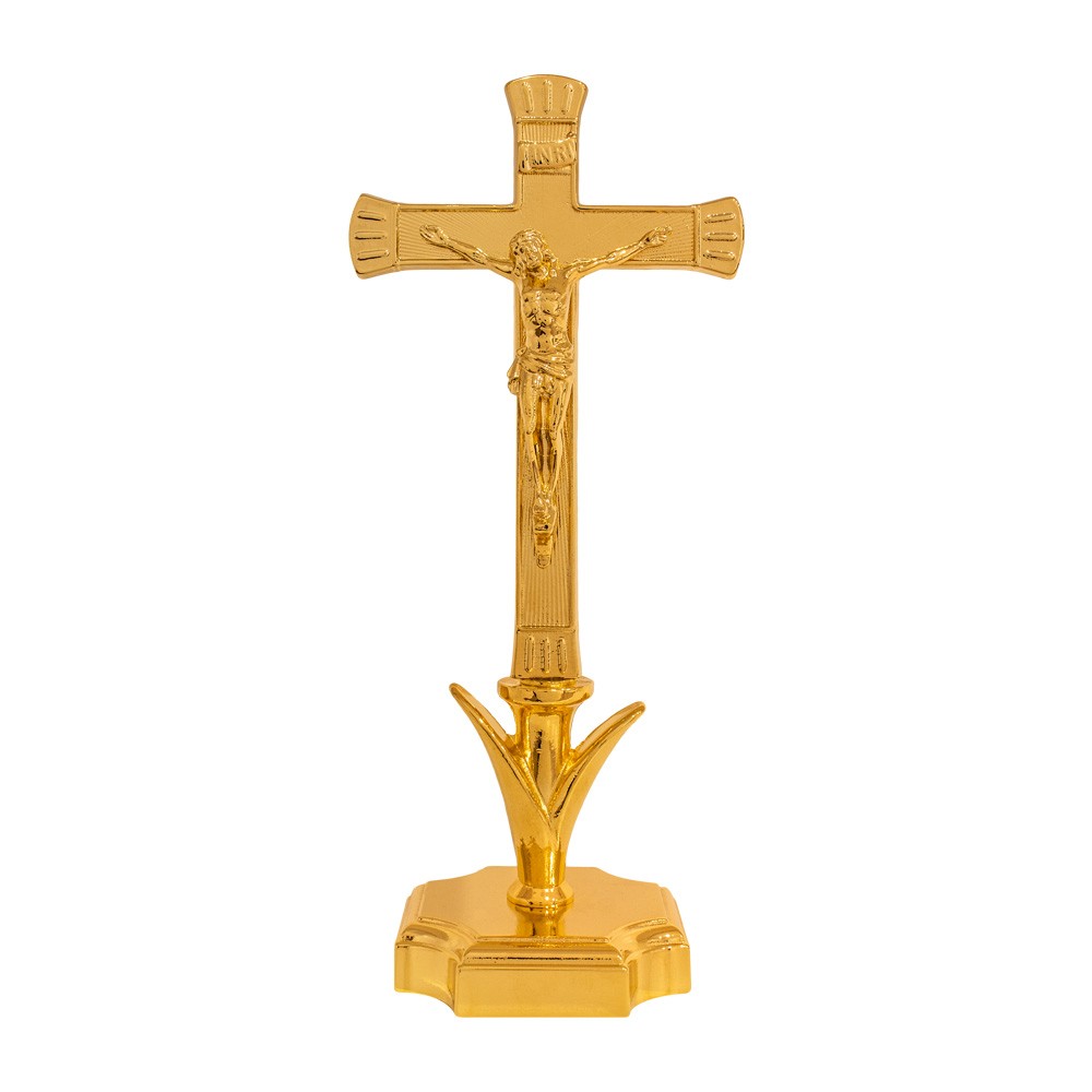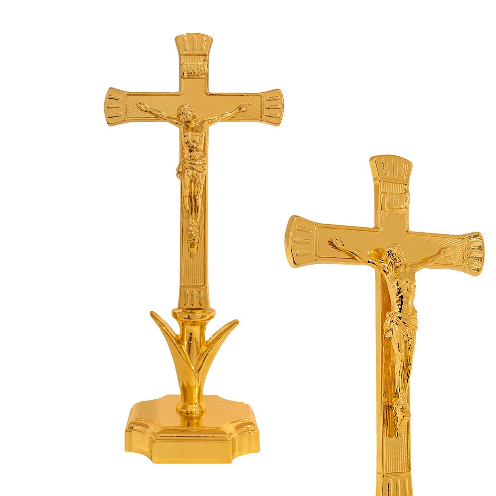 Altar cross placed on candlestick. The cross is 28 cm tall and made of golden brass. Excellent quality product, entirely made by an Italian company.