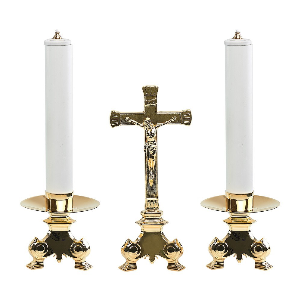 The set is composed of a cross with two candle holders and fake candles. Made of golden brass.