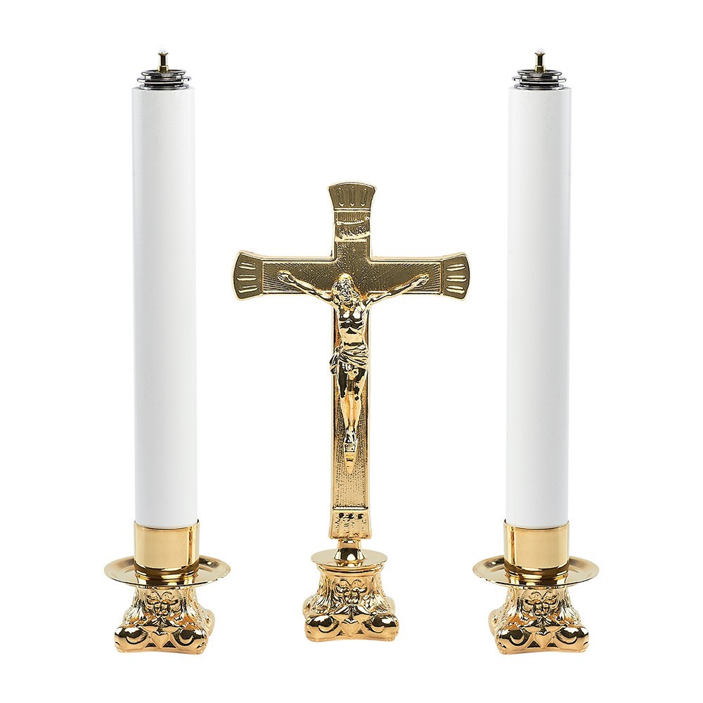 Complete set with cross, candle holders and candles. The set is made of golden brass.