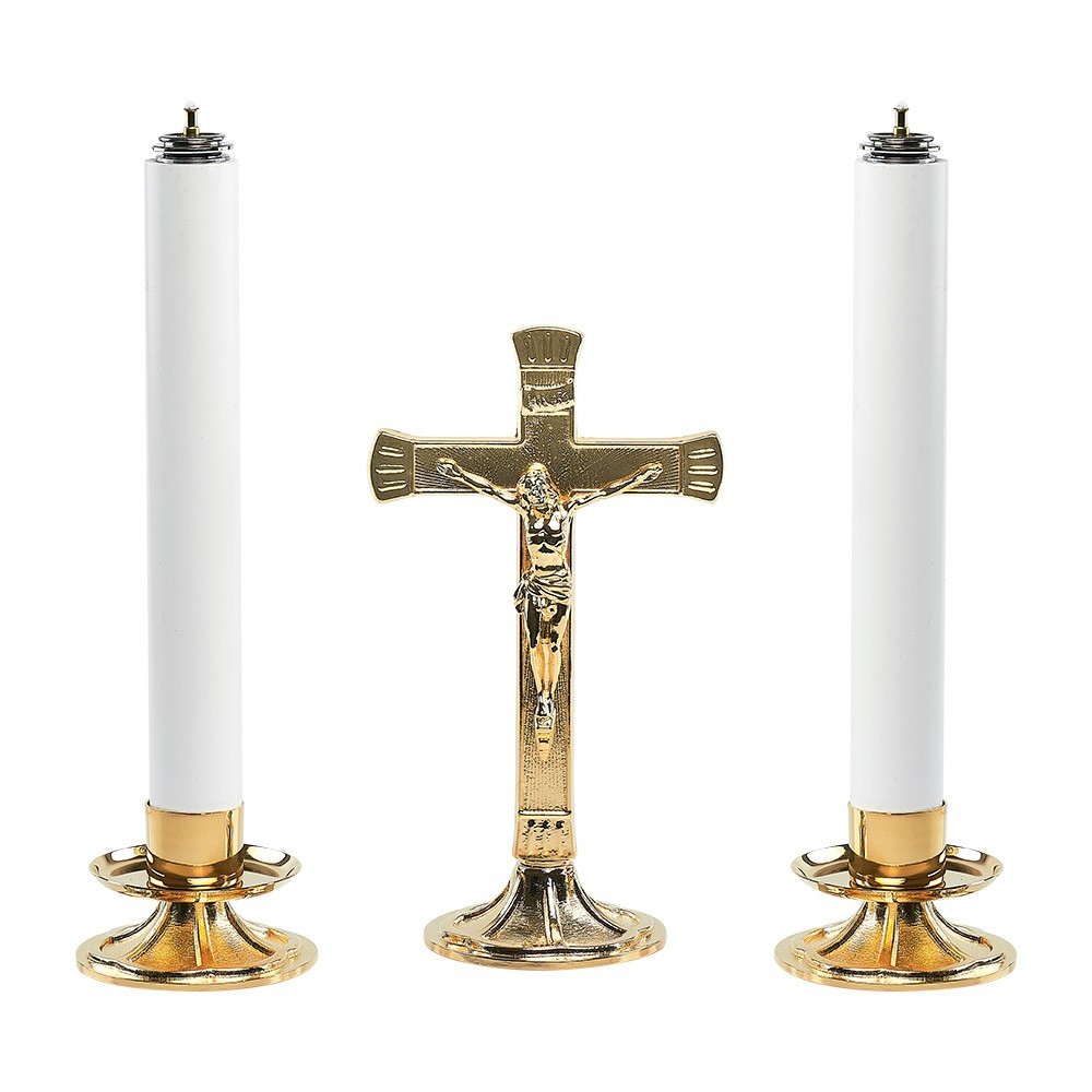 The set is composed of a 24 cm tall cross and a pair of candle holders complete with candles. The set is entirely made of golden brass.