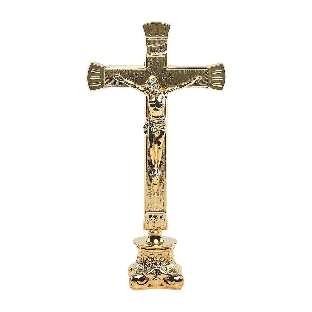 Altar cross on candlestick, made of golden cast brass. The cross is 35 cm tall.