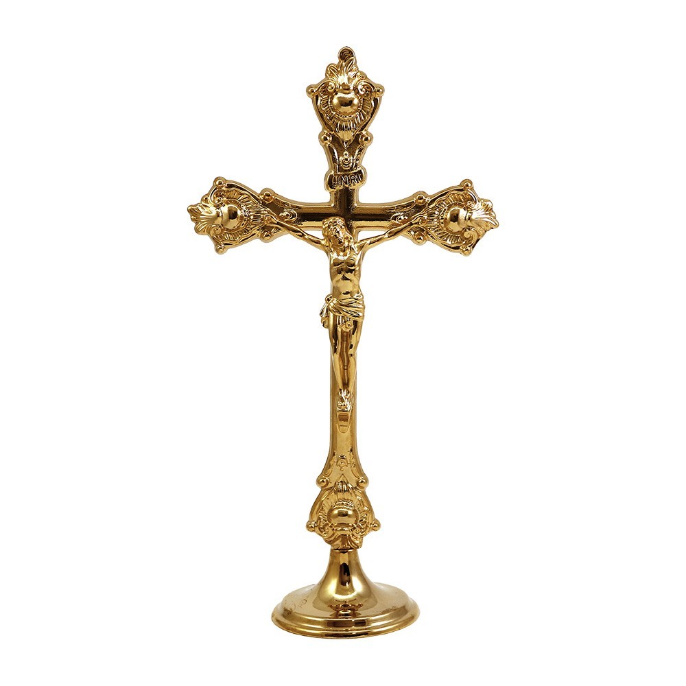 Altar crucifix entirely made of brass with gold finish. The cross is finely crafted and has a height of 36 cm.