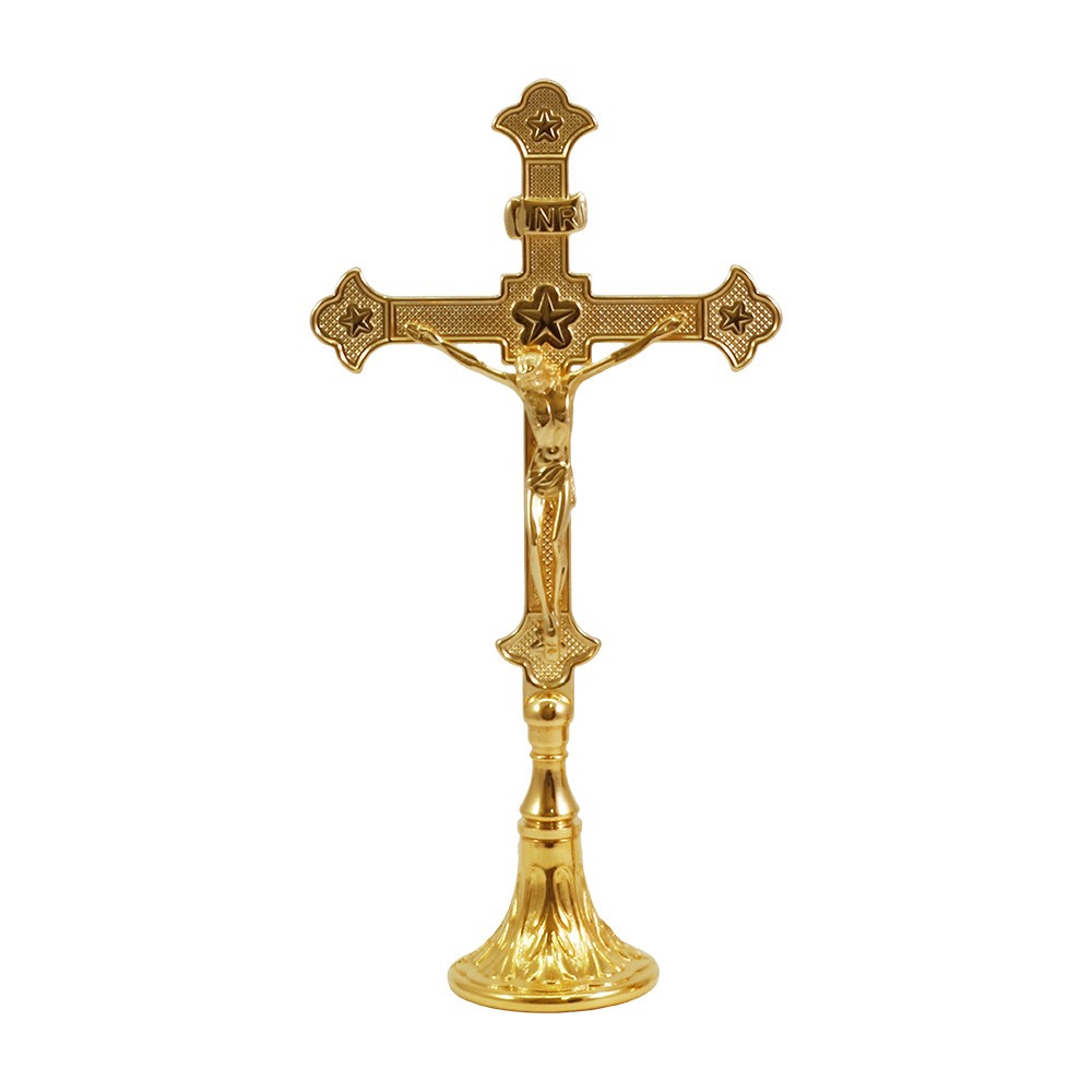 Altar crucifix made of 24k golden brass. The cross is 29.5 cm tall, features a decorated base and its extremities are decorated with little stars.