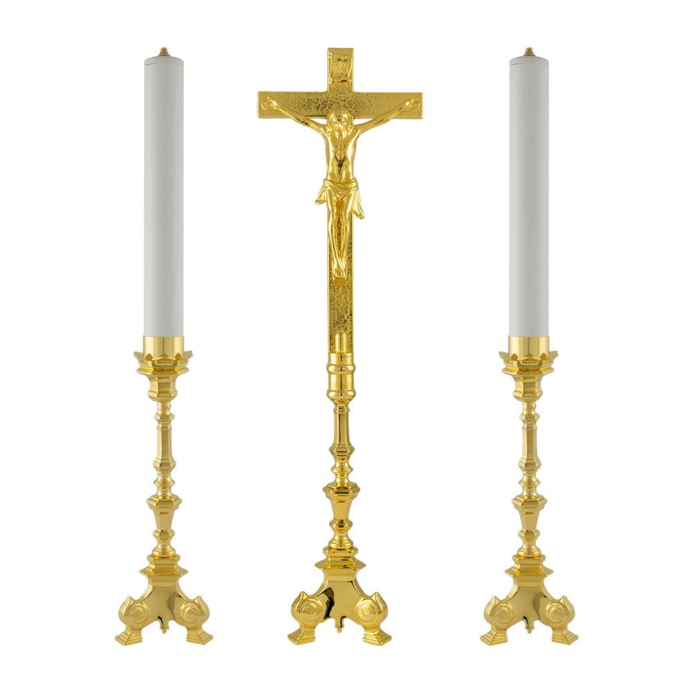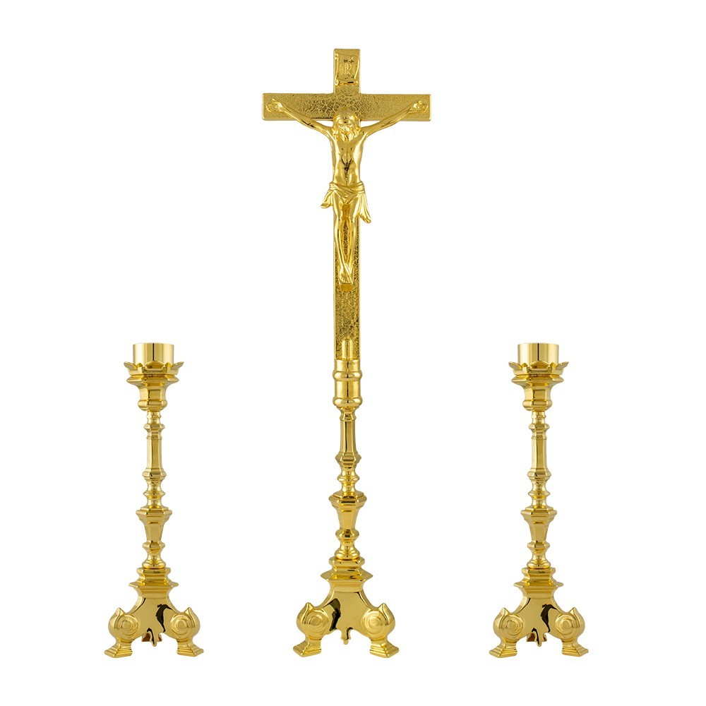 Shipping in 2 weeksAltar set complete of cross in brass and pair of candle holders.