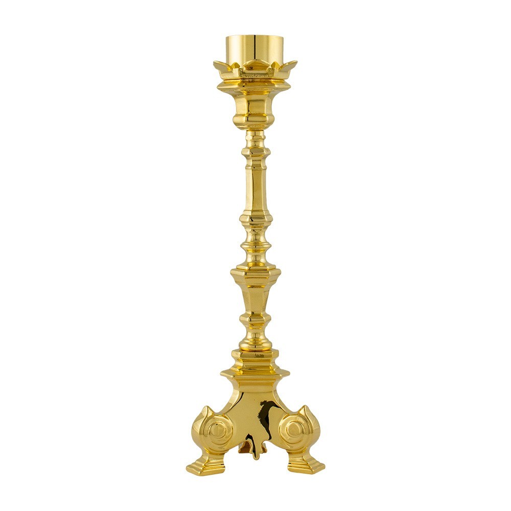 Baroque style Altar set consisting of 3 pieces. Complete with cross + 2 candle holders made of gold-plated brass. The cross is placed on a candlestick which reaches a maximum height of 57 cm. The candle holders are 30 cm tall and can hold fake candles with a casing with a maximum diameter of 4 cm. The fake candles are not included.