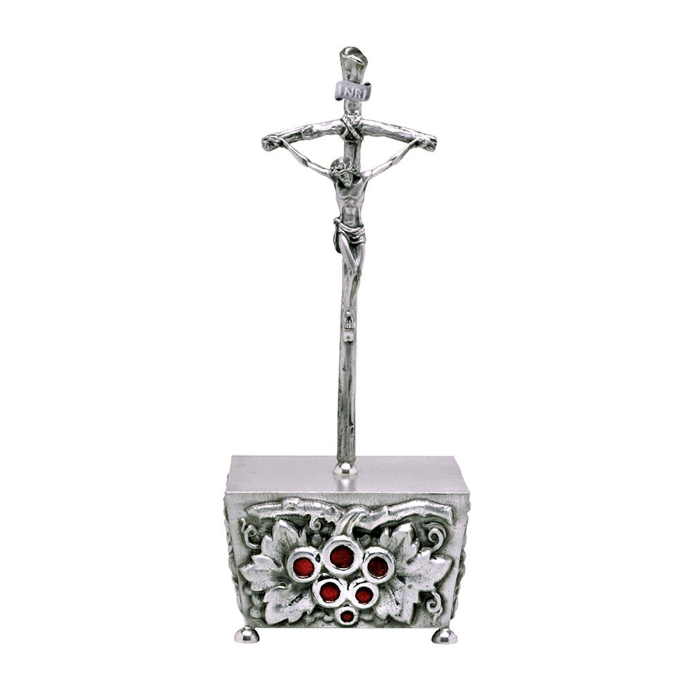 This table cross is made of silver-plated cast brass with red enamel on the base. It is 32 cm tall. Entirely made in Italy by artisans with great experience in the crafting of sacred furnishings.