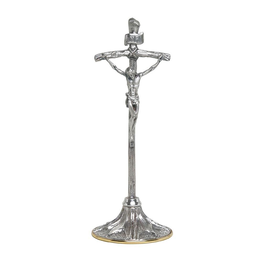 Altar crucifix for church. It’s made of silver-plated brass and has a finely decorated base. This cross is 32 cm tall. Product of excellent workmanship, entirely made in Italy by artisans specialized in the crafting of sacred furnishings.