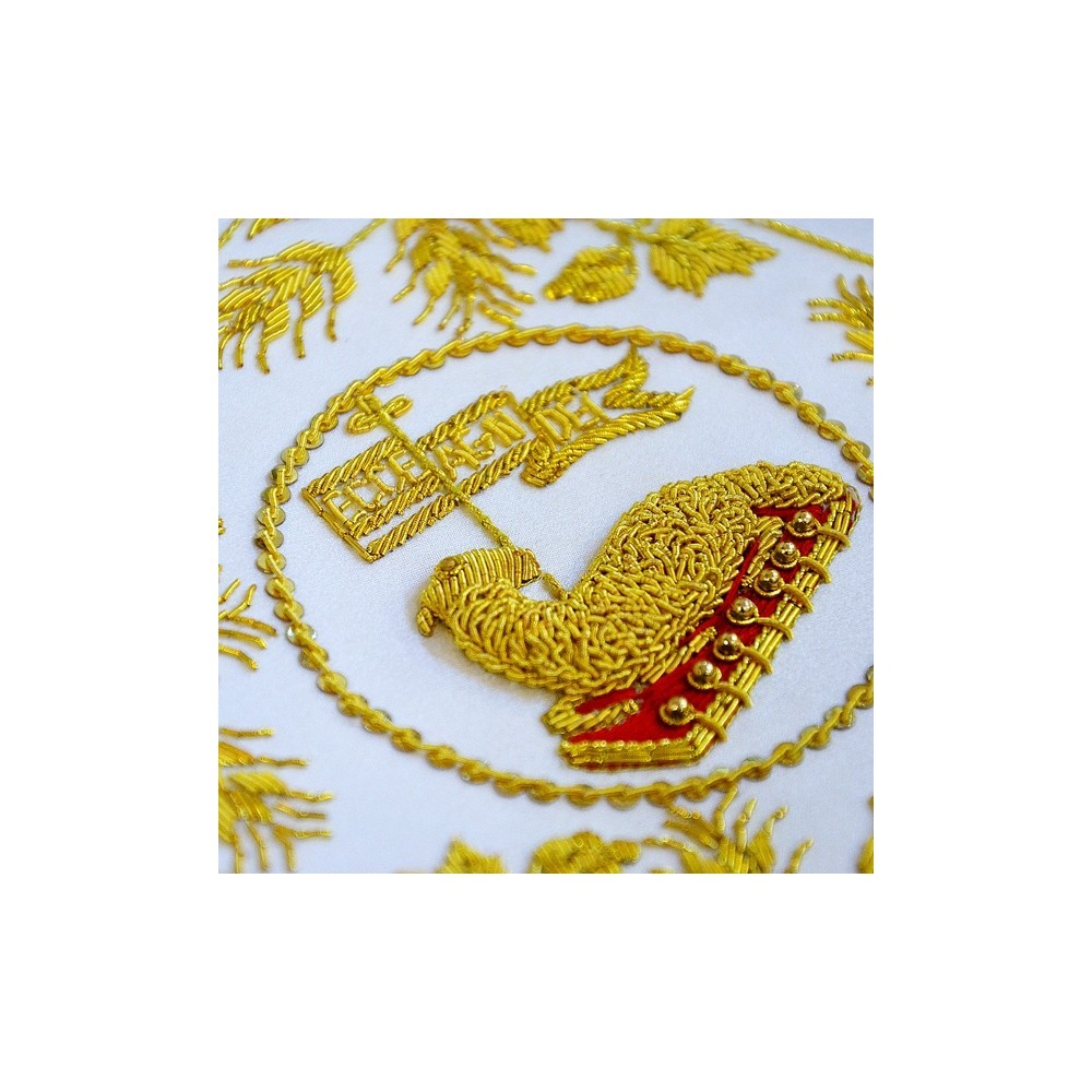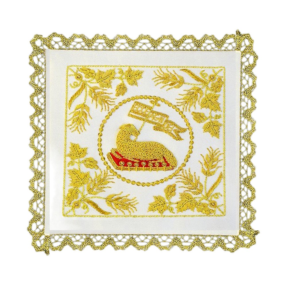 Hand-embroidered chalice pall finished with a golden lace border. A prestigious item, ideal for solemn occasions or as a gift.