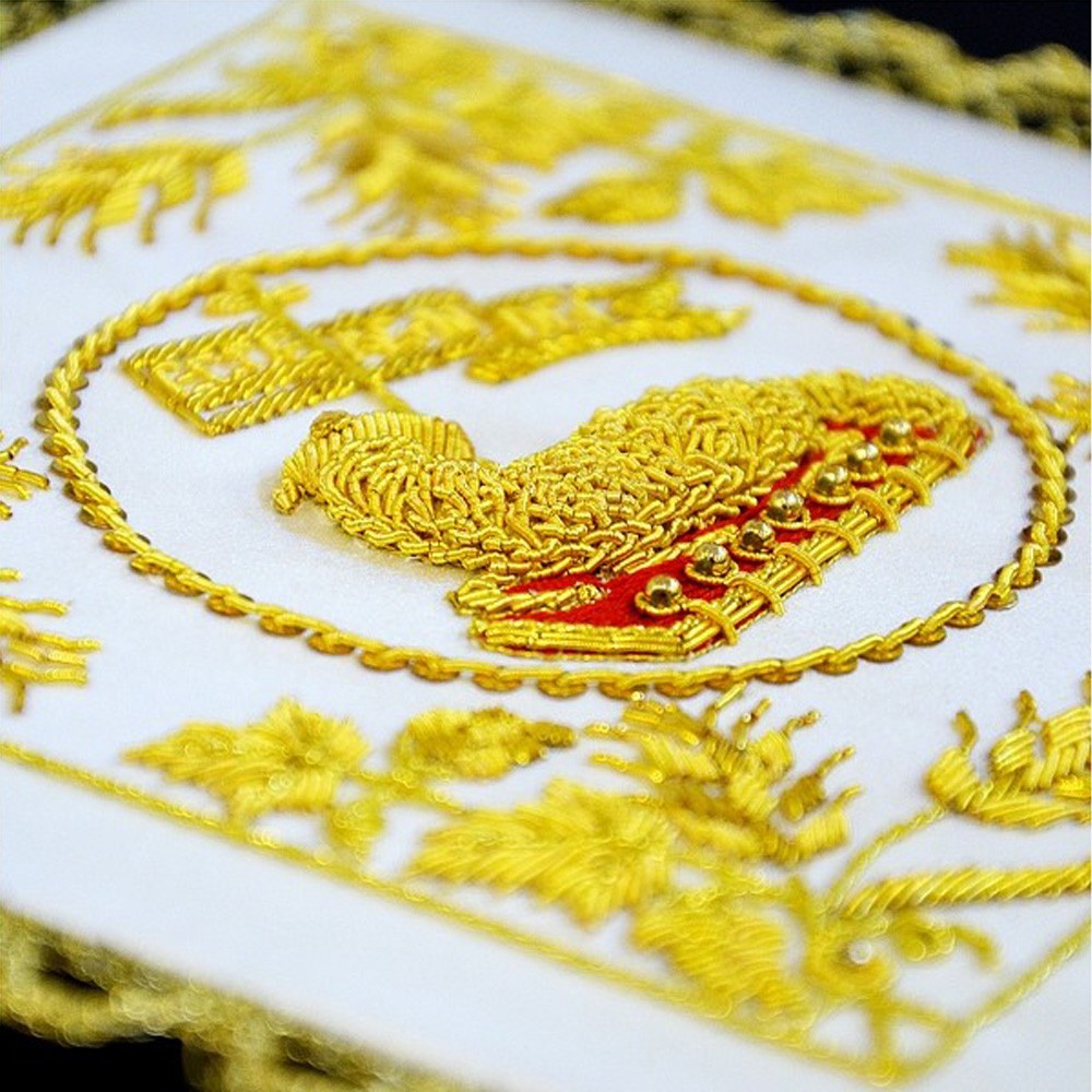Liturgical chalice pall with meticulously hand-embroidered design.