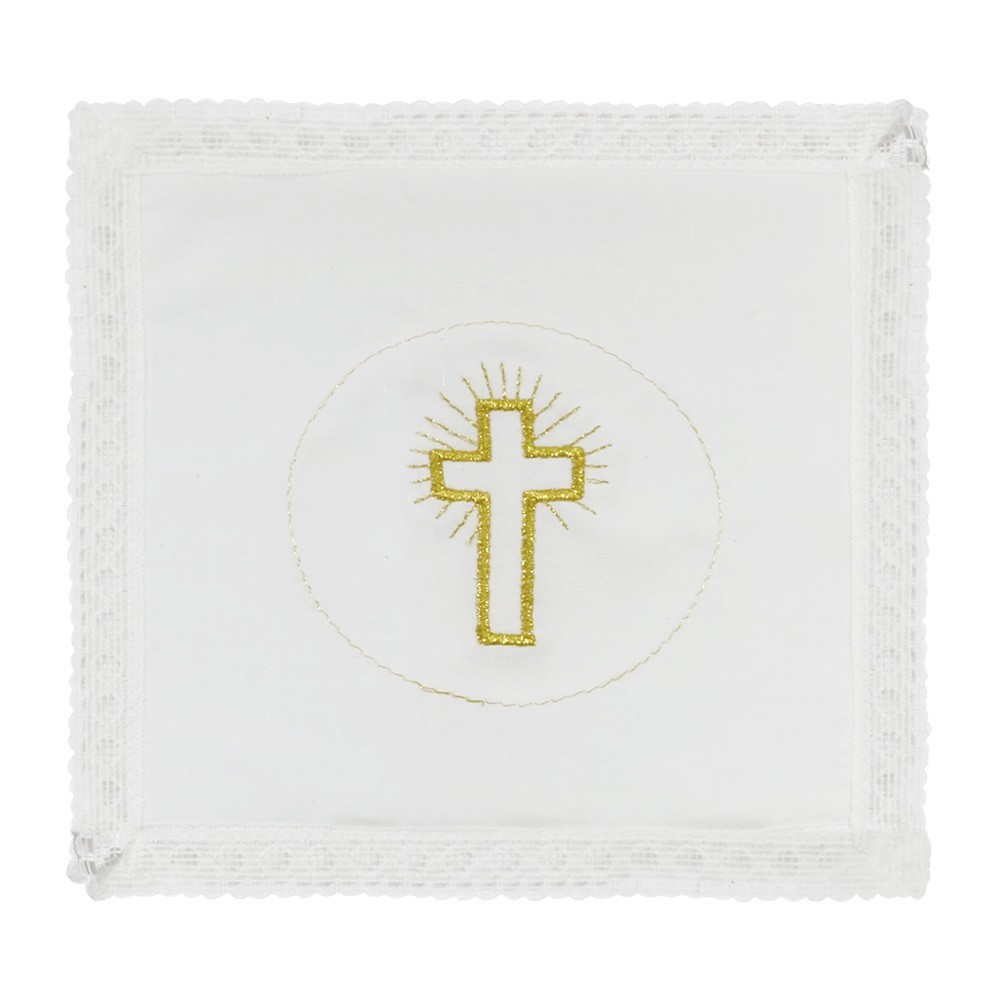 Chalice veil (pall) made of light fabric in pure cotton. It features a lace trim sewn on the edges and central cross embroidery made using gold thread. Entirely made by an Italian company with consolidated experience over the years.