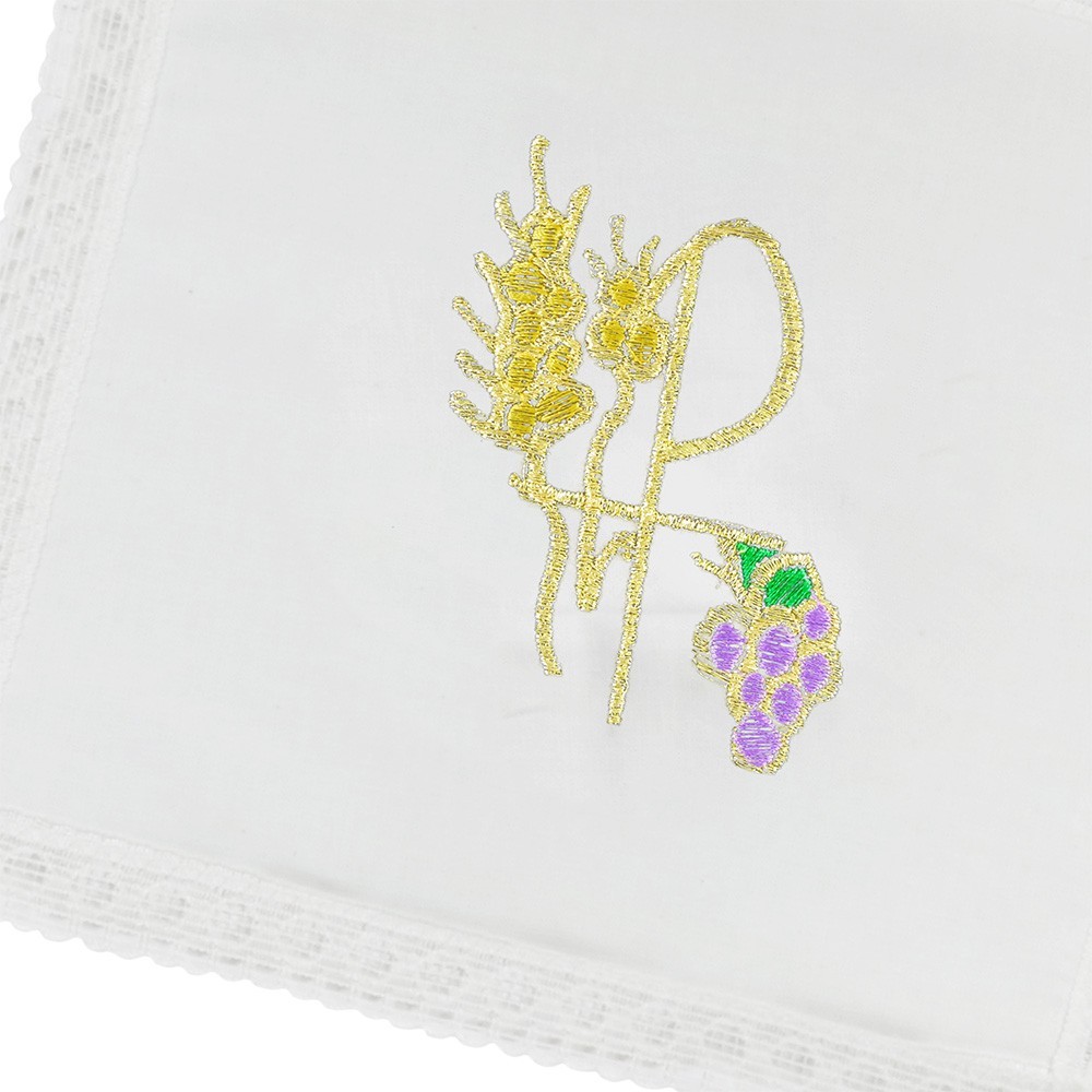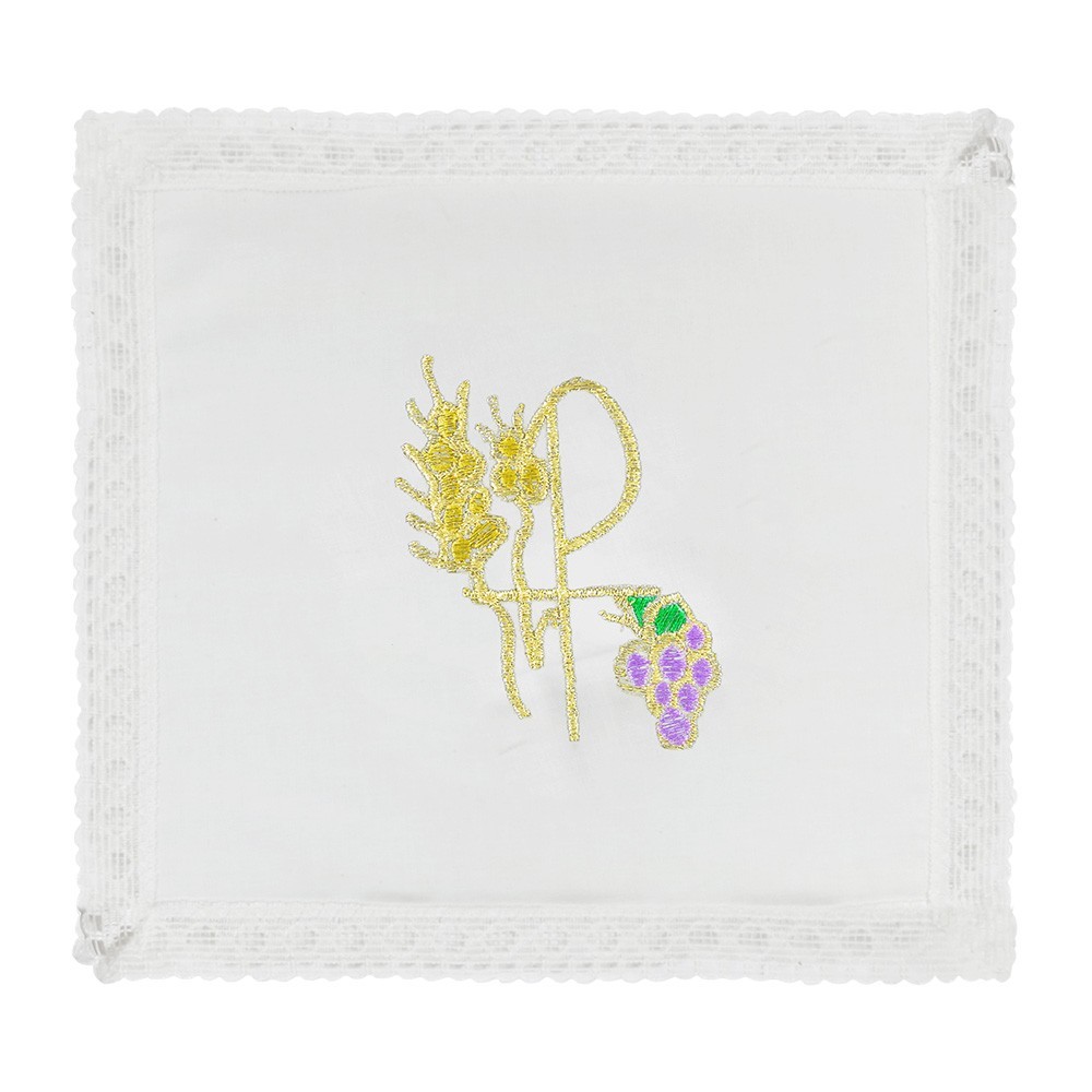 Chalice veil (pall) made of light fabric in pure cotton. It features a lace trim sewn on the edges and Px embroidery with ears of wheat and grapes. The embroidery is made using gold and colored threads.