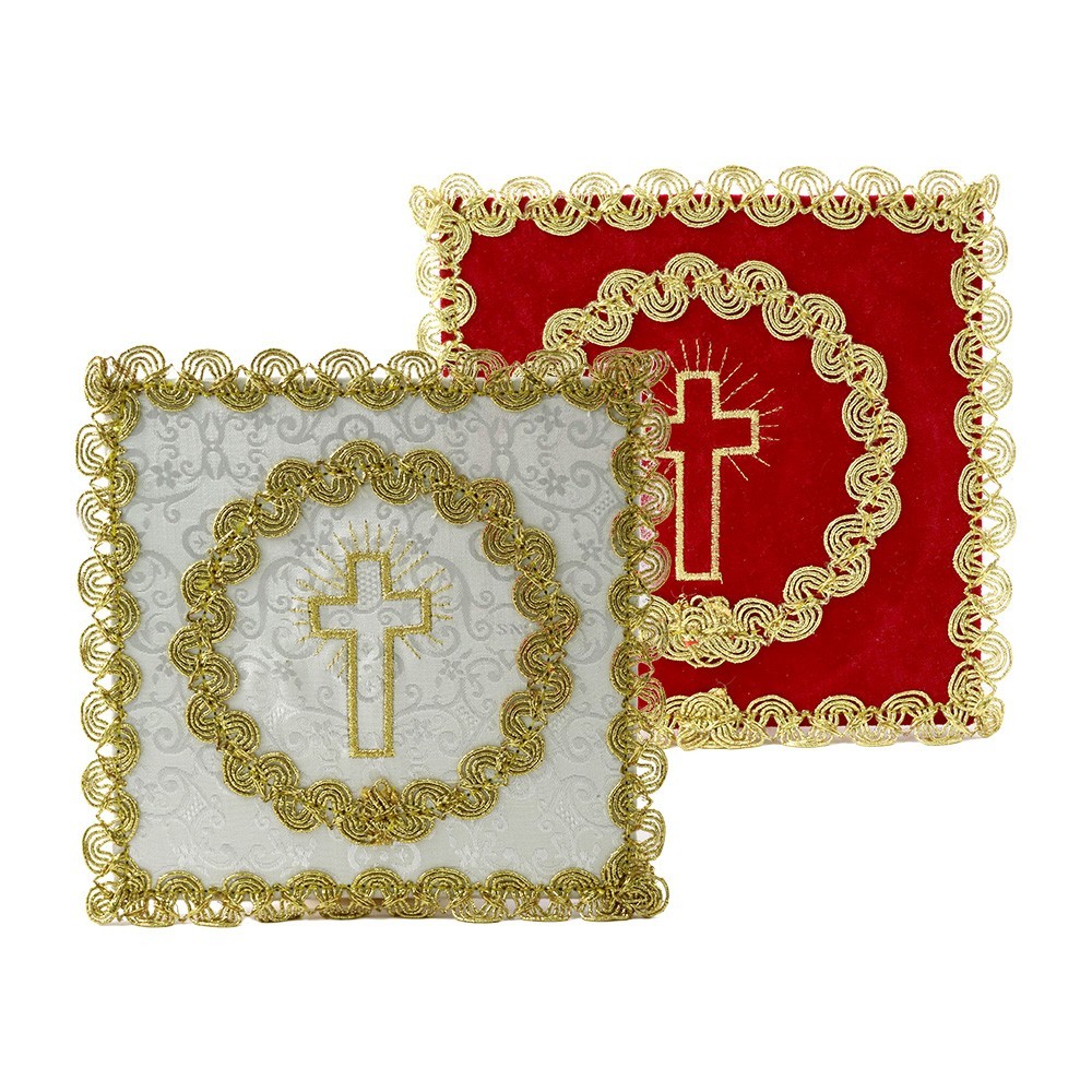 Rigid chalice veil (pall) made of fine satin fabric. It features a cross embroidery made using gold threads and is available in ivory and red. Choose the color you want!