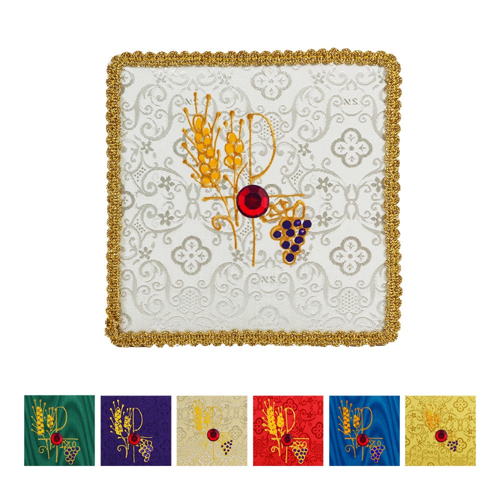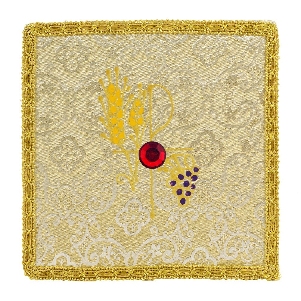 Rigid chalice veil (pall) made of satin, embroidered on damask jacquard fabric. The center of this veil is decorated by a red stone.