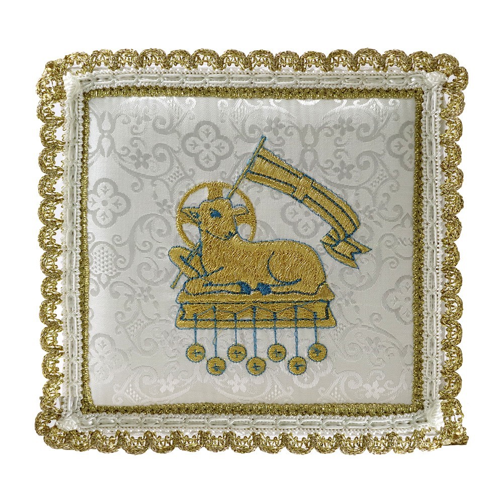 Chalice veil (pall) made of satin with Lamb of Peace embroidery.