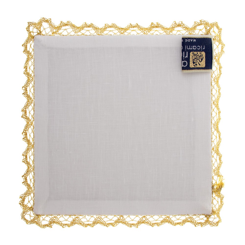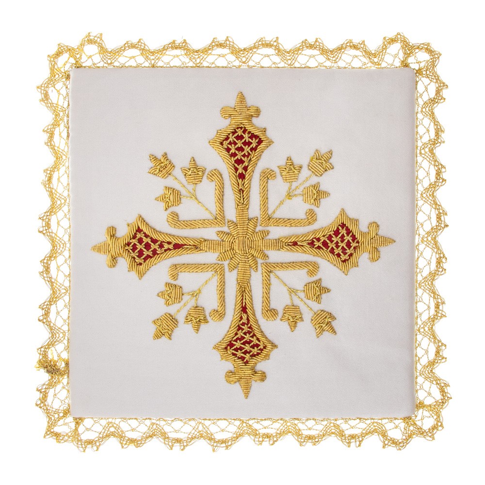 The chalice veil, also known as pall, is a liturgical item consisting of a square fabric piece – with a side measuring 15 or max. 20 cm – which can sometimes be reinforced through a backing. Its border is often embroidered or finished with lace.