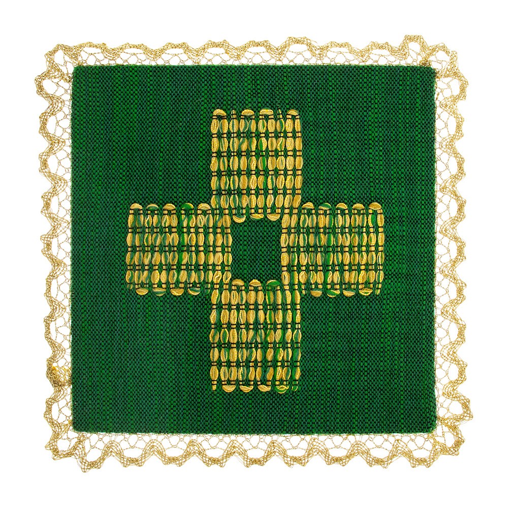 Liturgical chalice pall with meticulously hand-embroidered design.