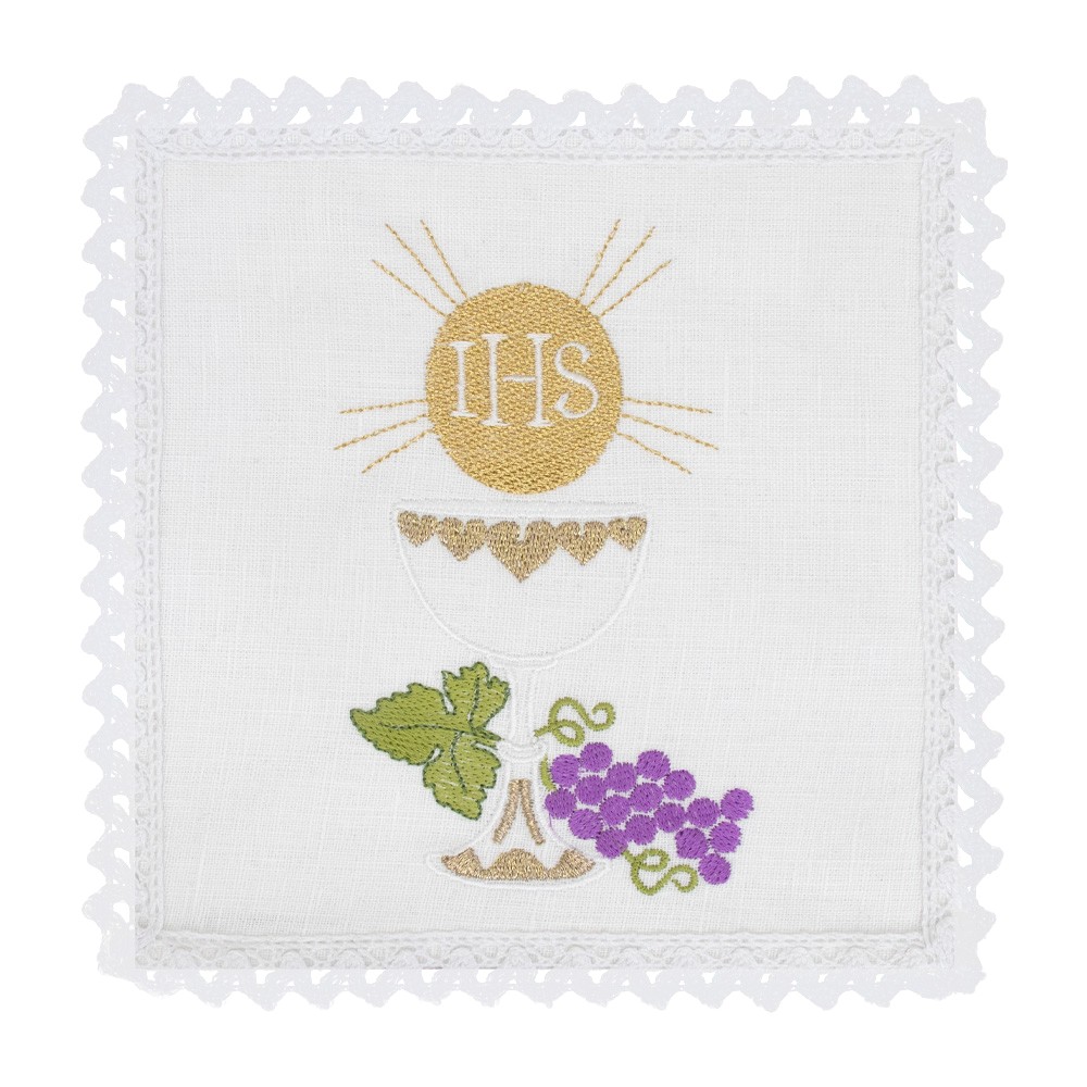 White chalice pall with embroidery of chalice, host and bunch of grapes.