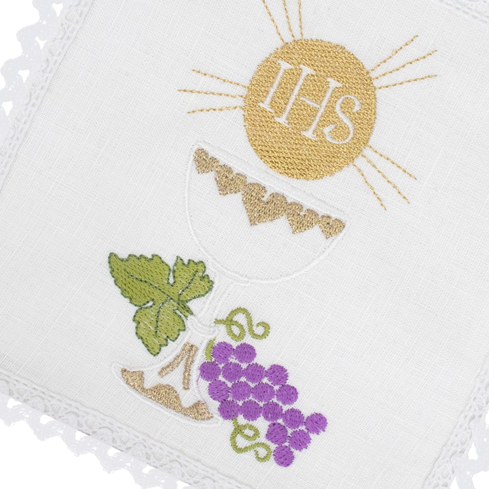 Chalice veil (pall) in cotton with JHS embroidery.