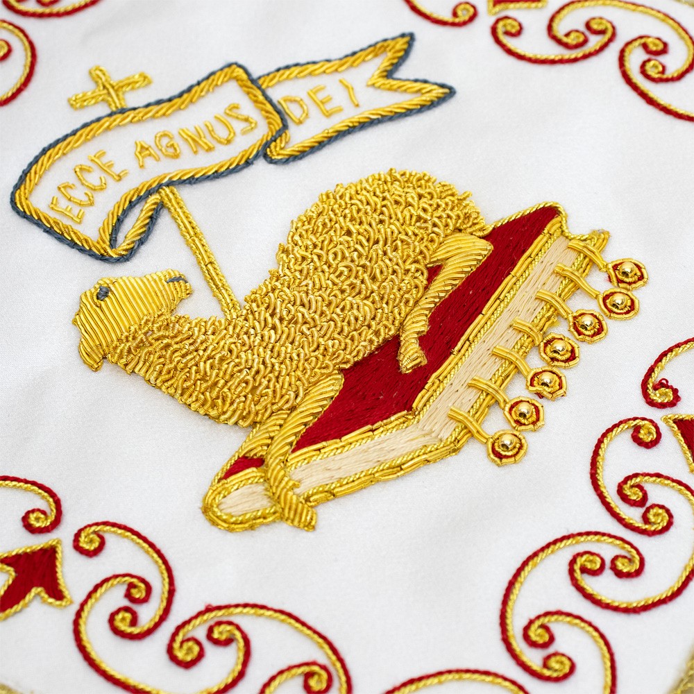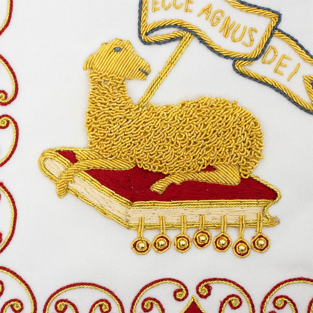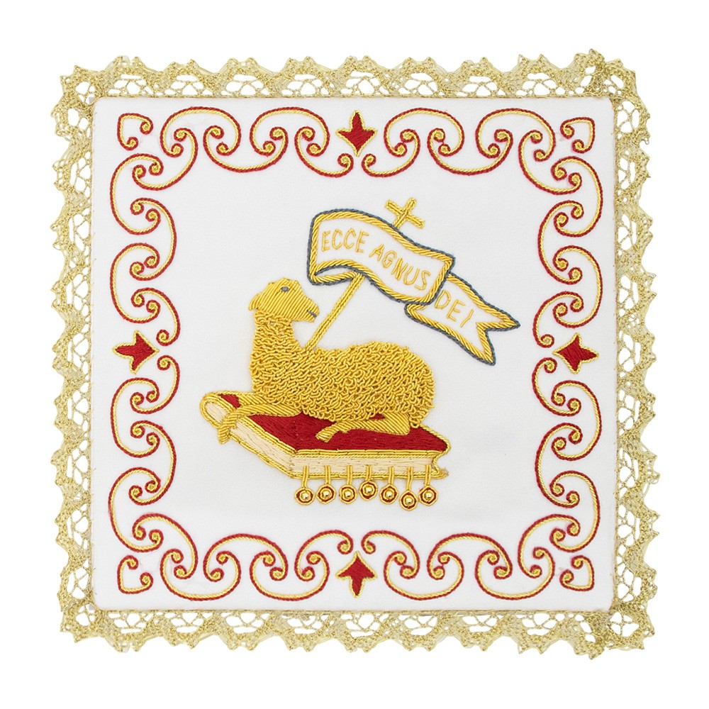 This ivory-colored liturgical pall is exclusively HAND-embroidered using ancient artisanal techniques and finished with a golden lace border.