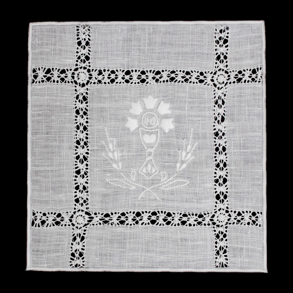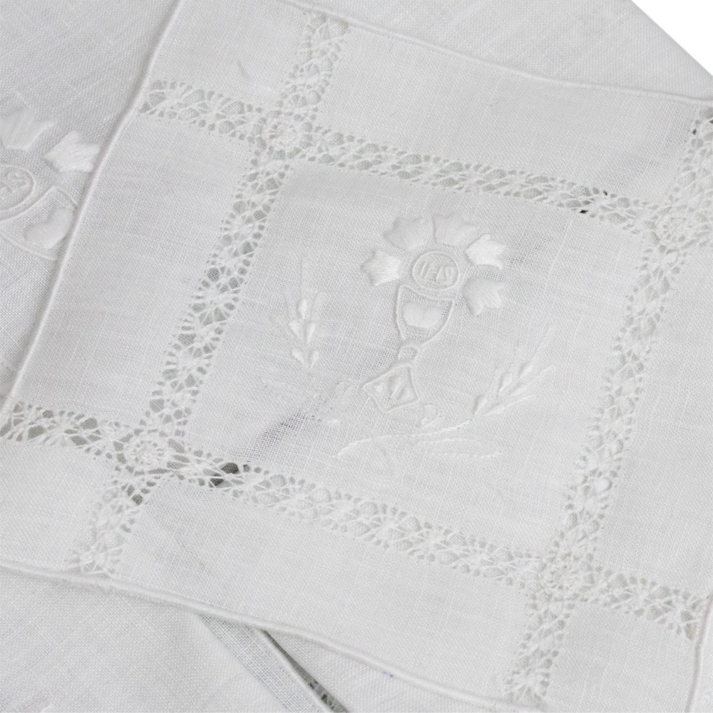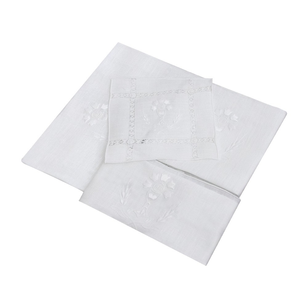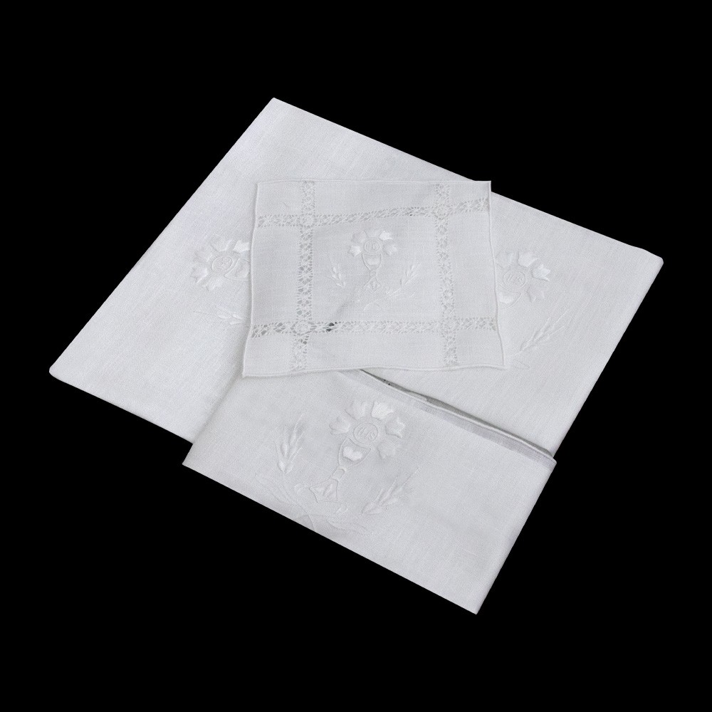 Consists of 4 pieces (corporal, purificator, lavabo towel, and chalice pall).