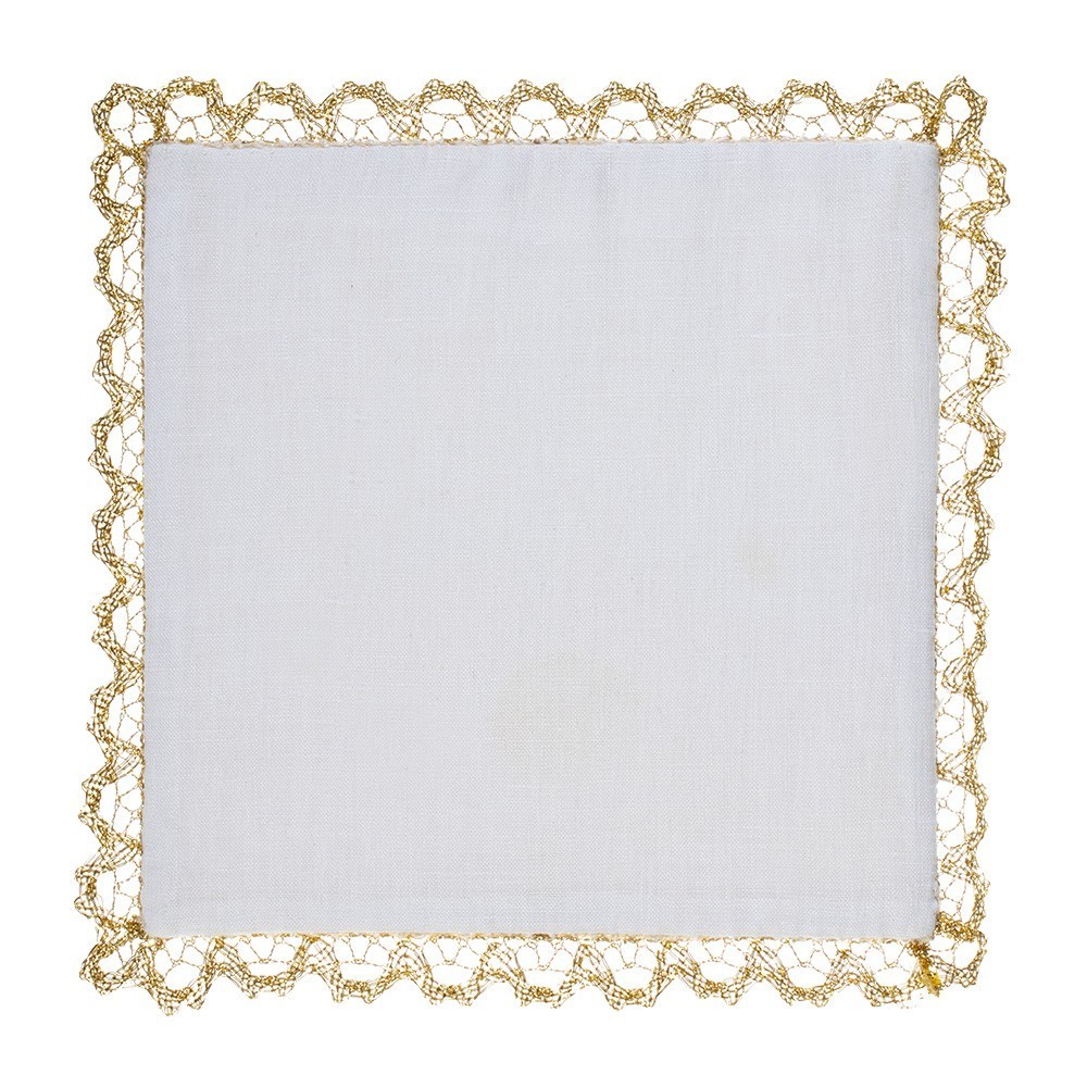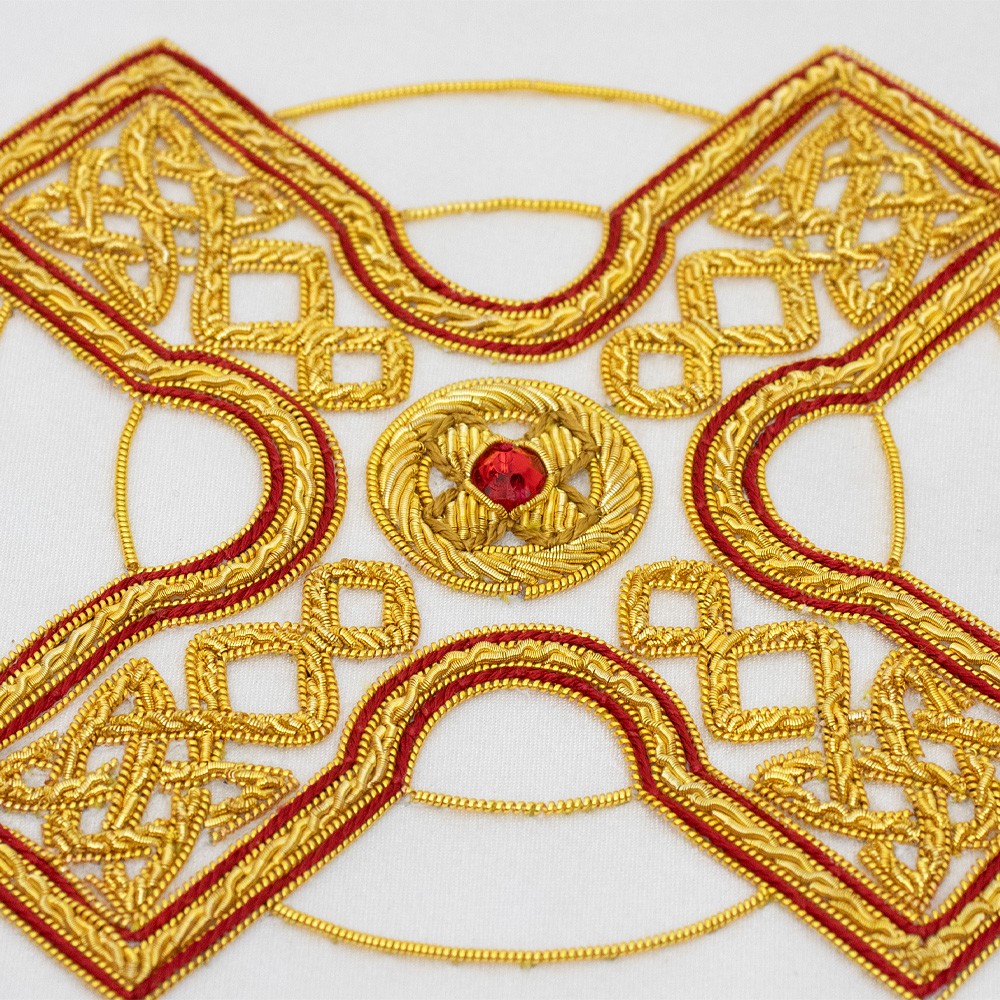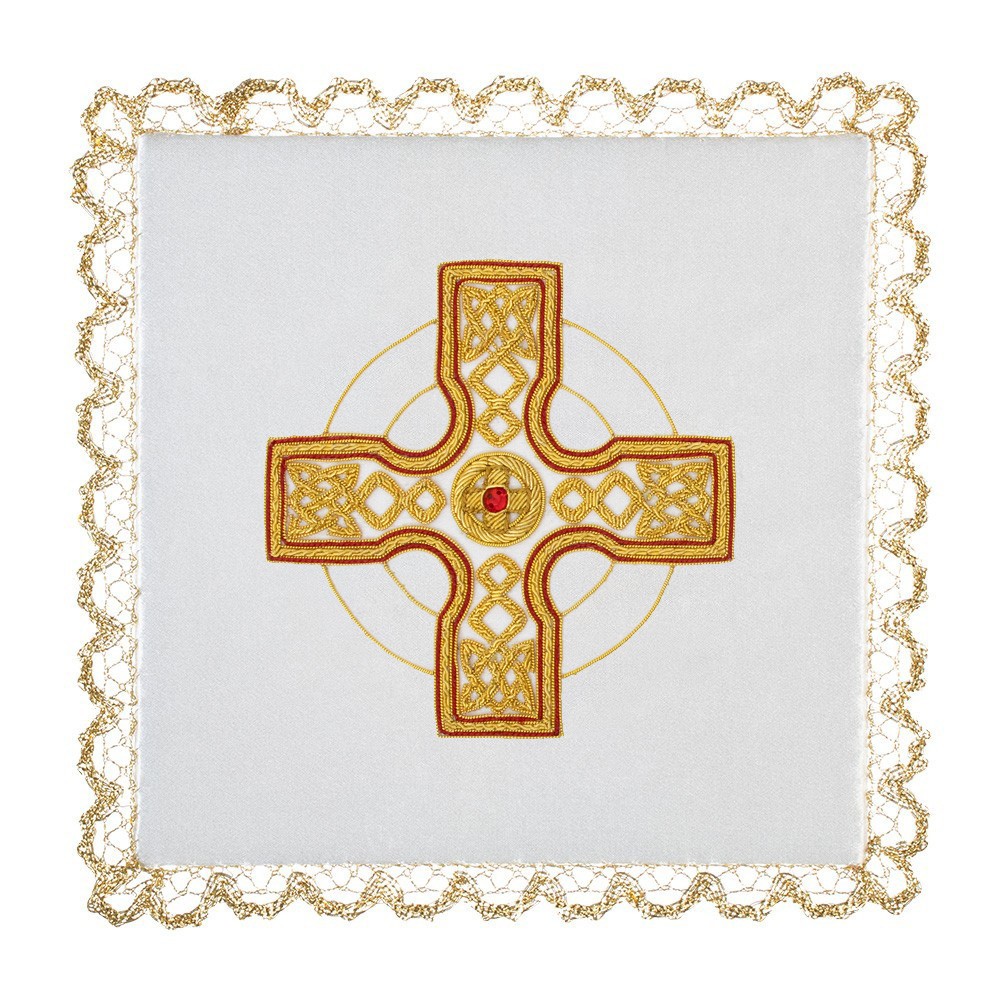 This chalice pall is crafted from premium pure silk fabric. The delicate embroidery depicts a cross with a central stone surrounded by circles, finely hand-stitched using traditional artisanal techniques. The product is finished with a golden lace border, enhancing its elegance.
