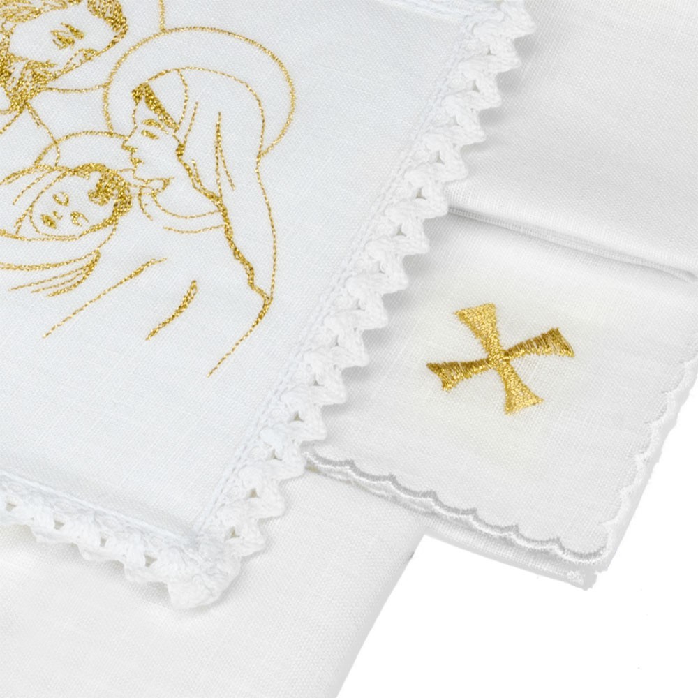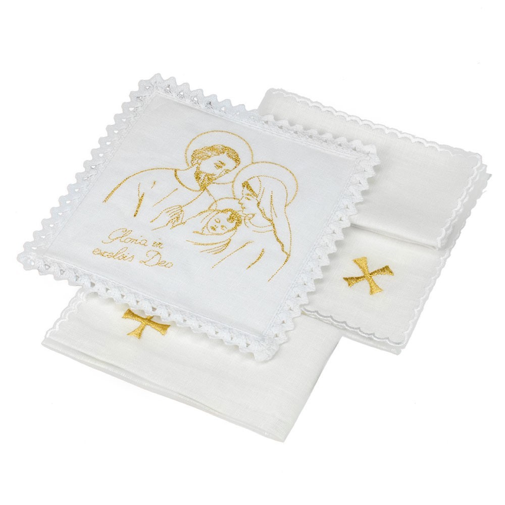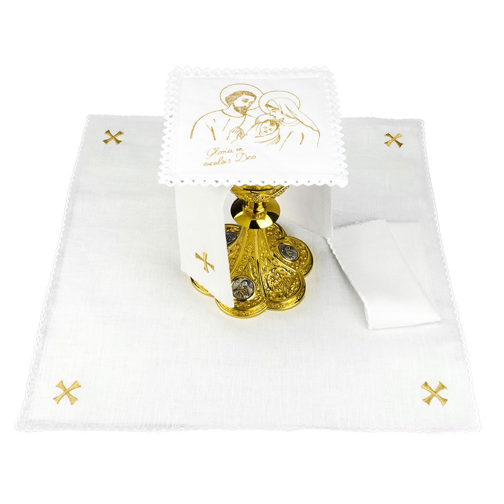 Mass Set in Pure Linen with golden embroidery of the Holy Family and “Gloria in Excelsis Deo” inscription.