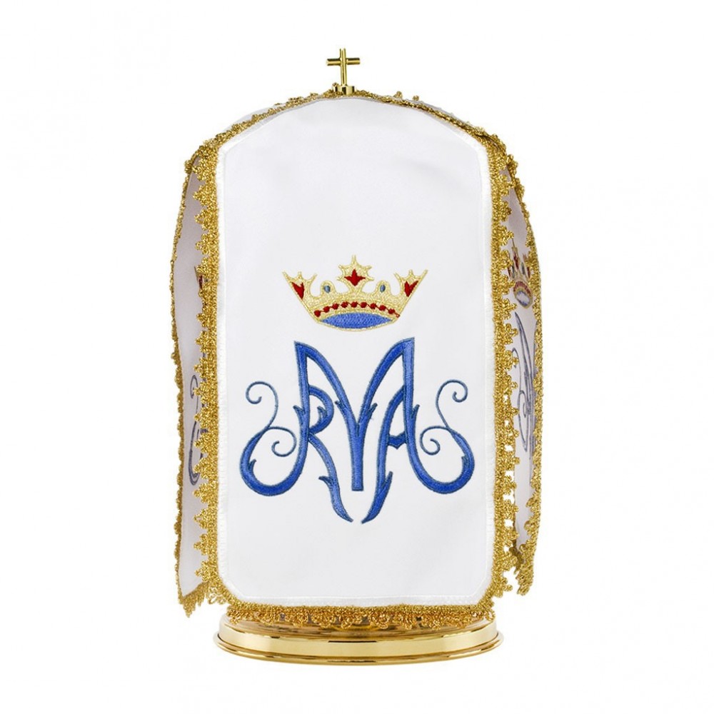 Ciborium veil in cotton blend with embroidery of the Marian Monogram in blue thread and golden crown on four sides. It features a golden trimming along the edges.