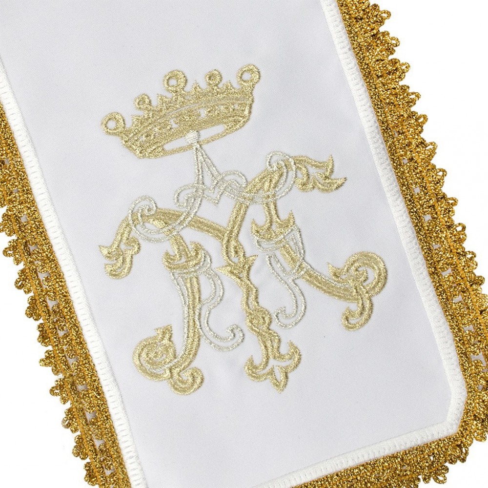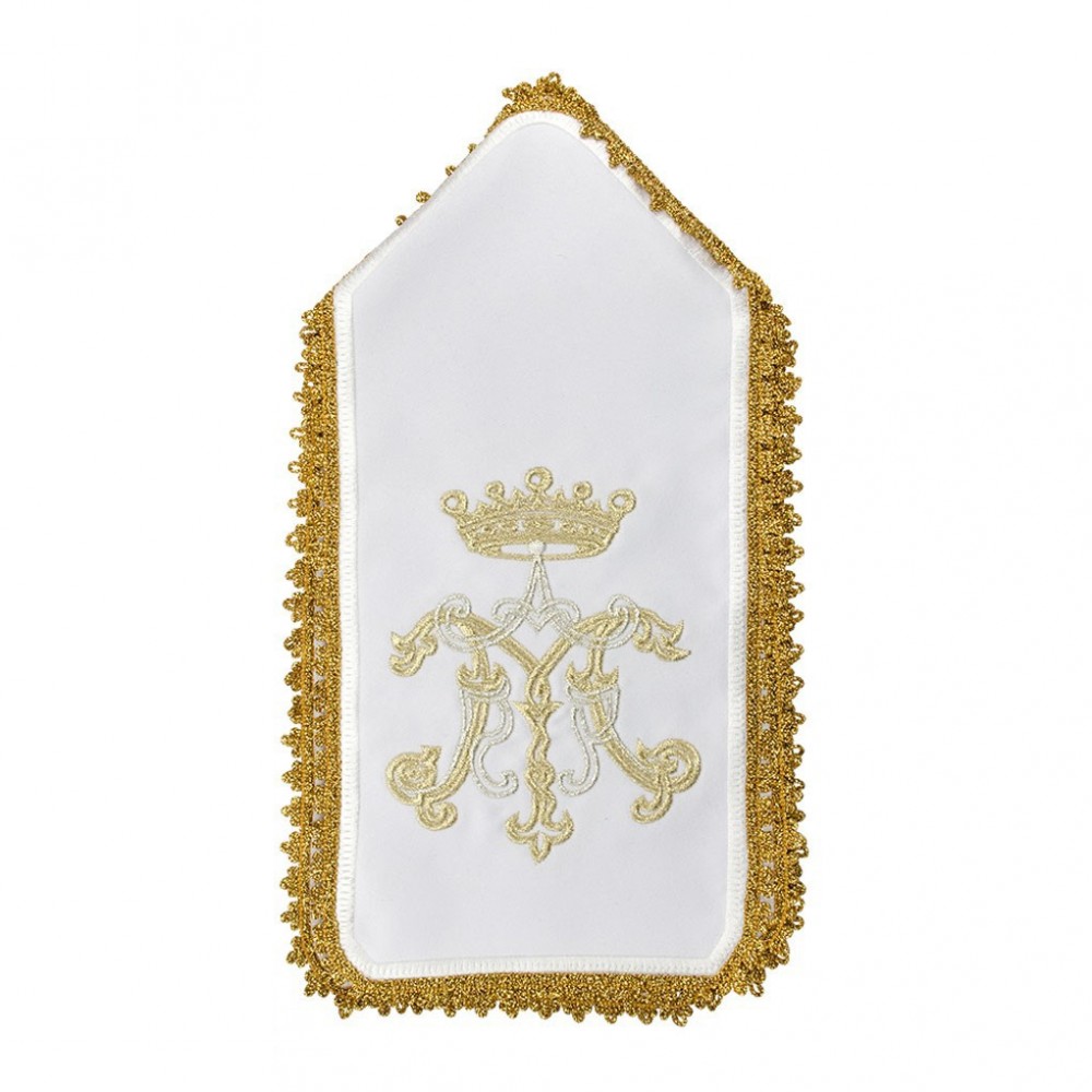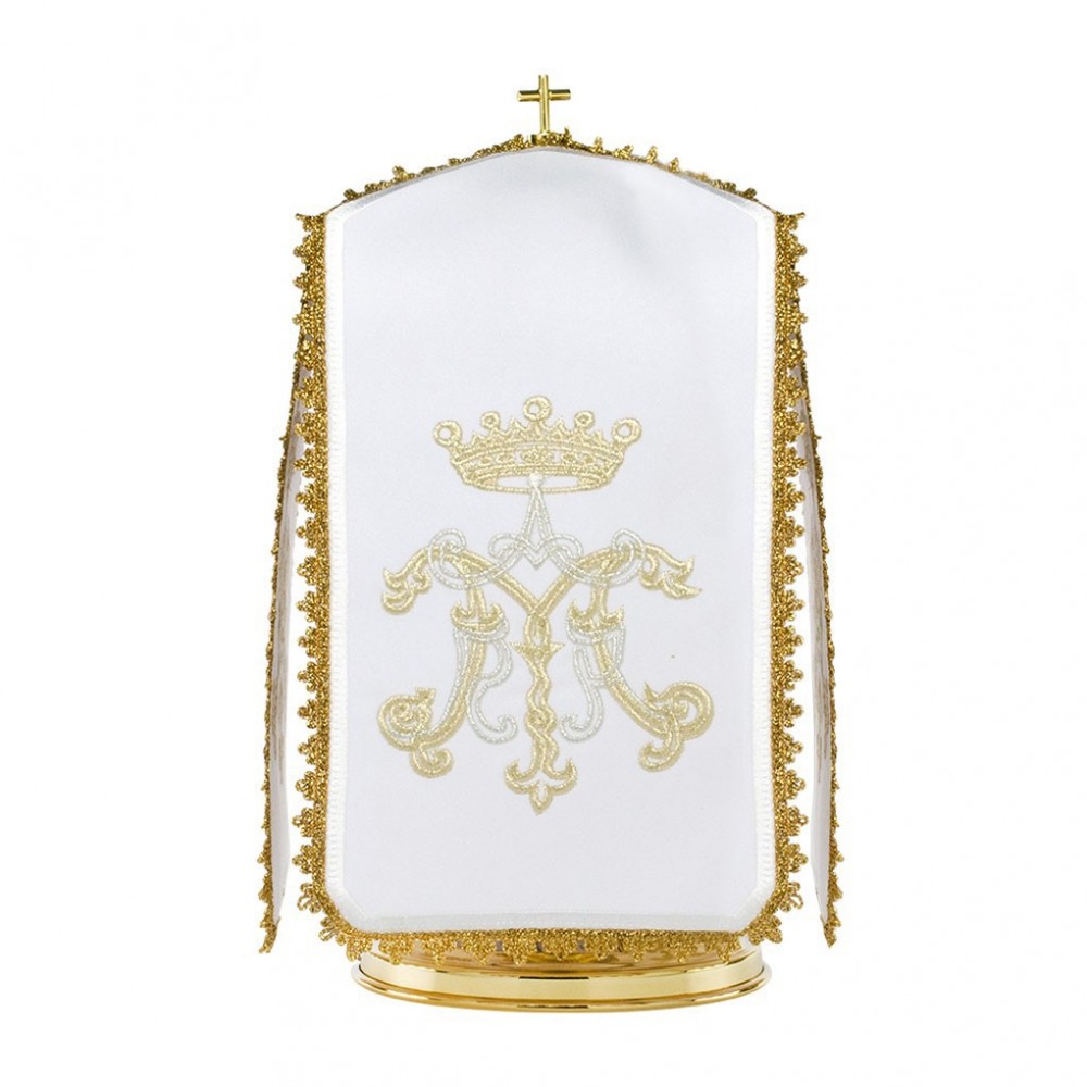 Ciborium Veil in cotton blend with embroidery of the Marian symbol. Each of the 4 sides is embroidered in gold and silver thread and is enriched with golden trimming along the edges.