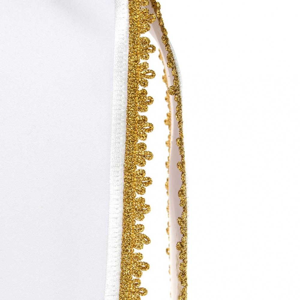 Made of elegant white satin with gold and blue embroidery.