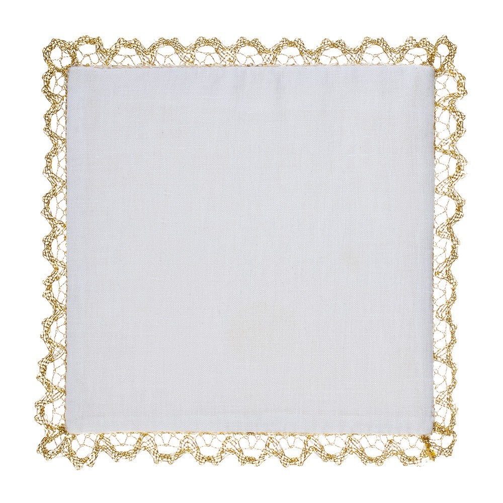 Shipping in 2 weeksHand-embroidered chalice pall finished with a golden lace border. A prestigious item, ideal for solemn occasions or as a gift.