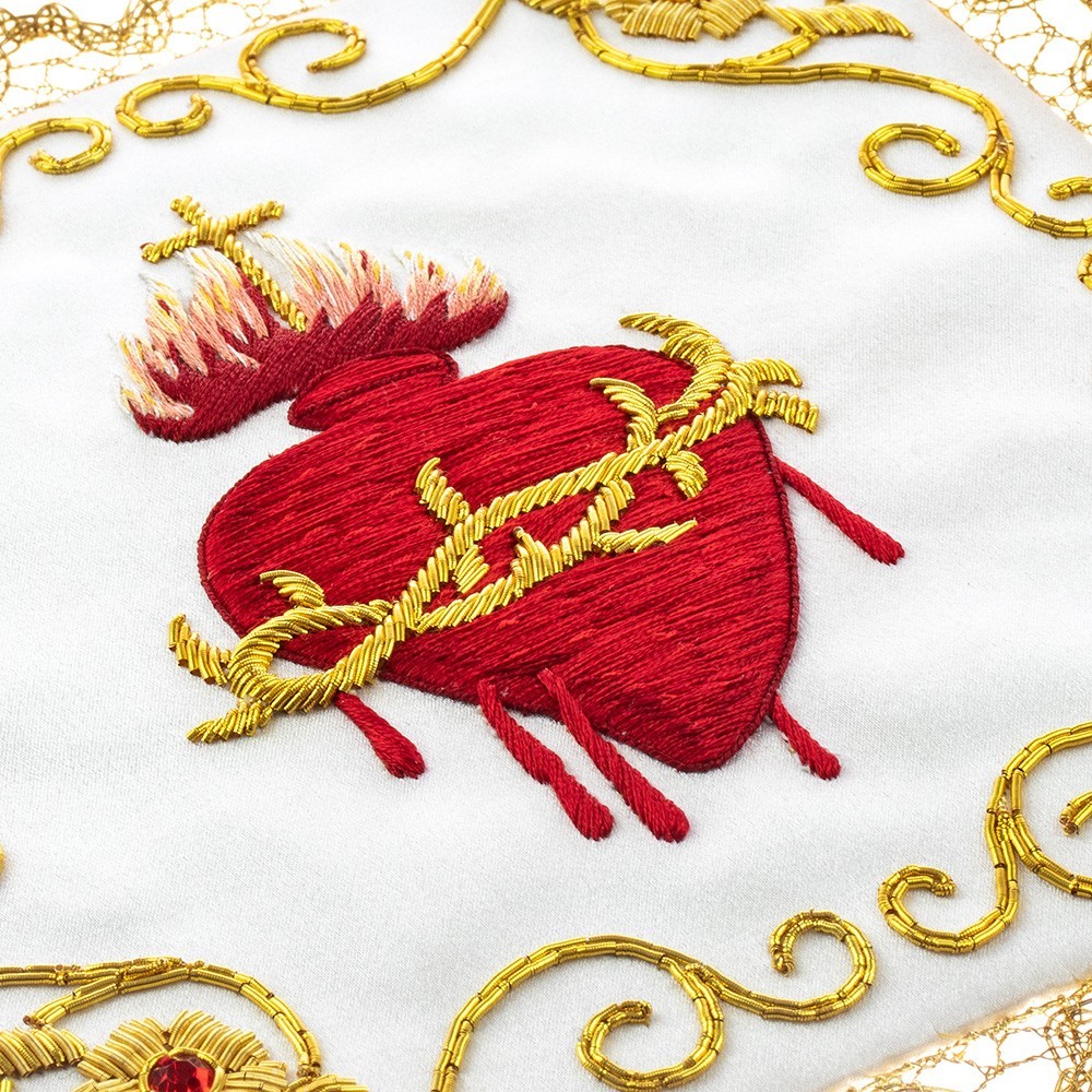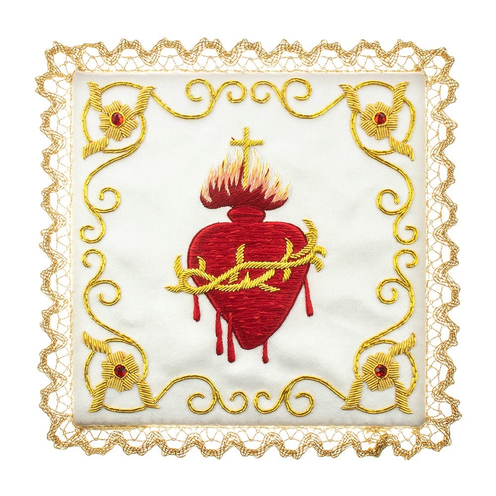 Shipping in 2 weeksHand-embroidered chalice pall finished with a golden lace border. A prestigious item, ideal for solemn occasions or as a gift.