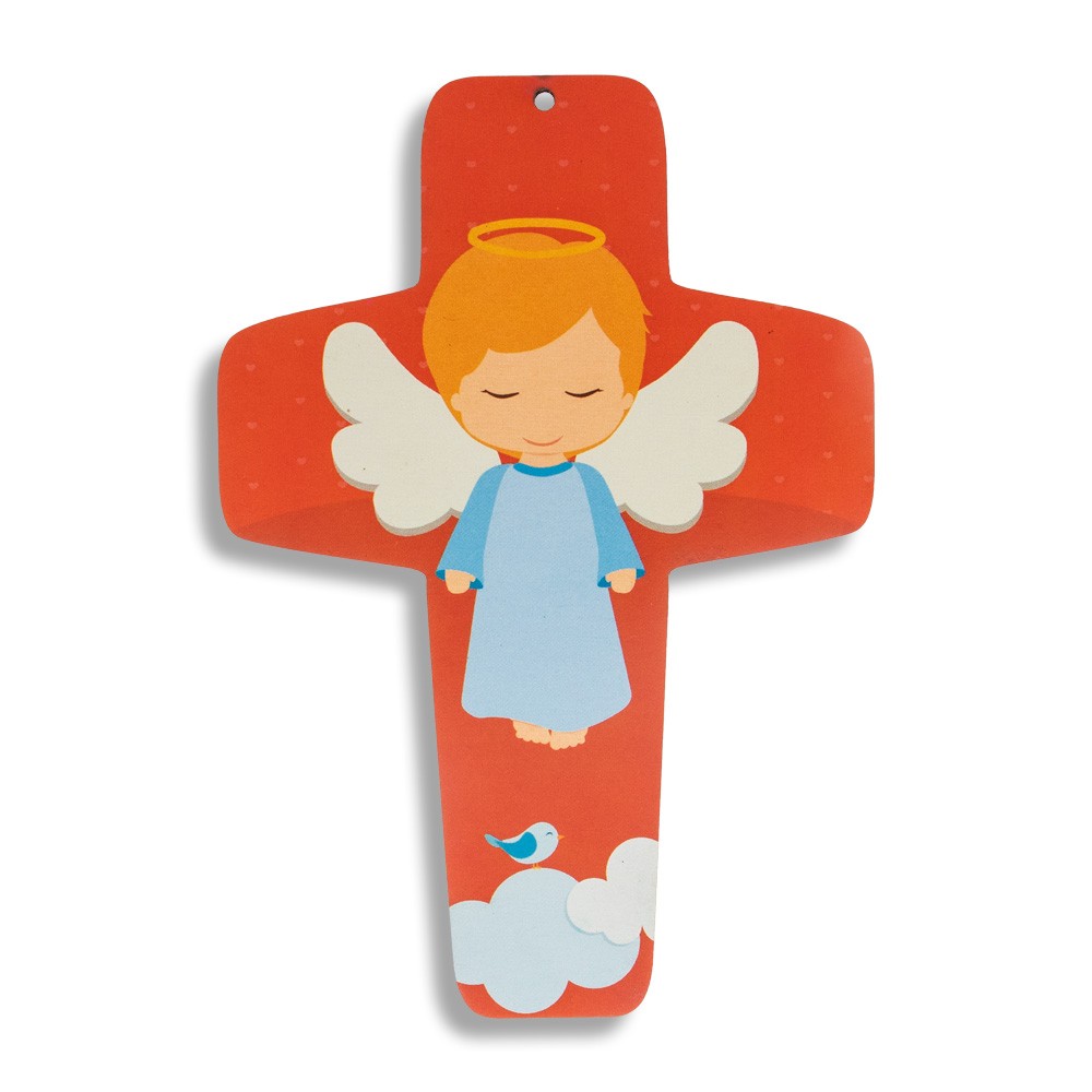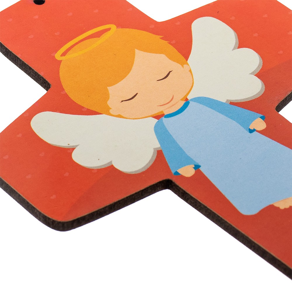 Orange cross for children with printed image of an angel with wings and halo.
