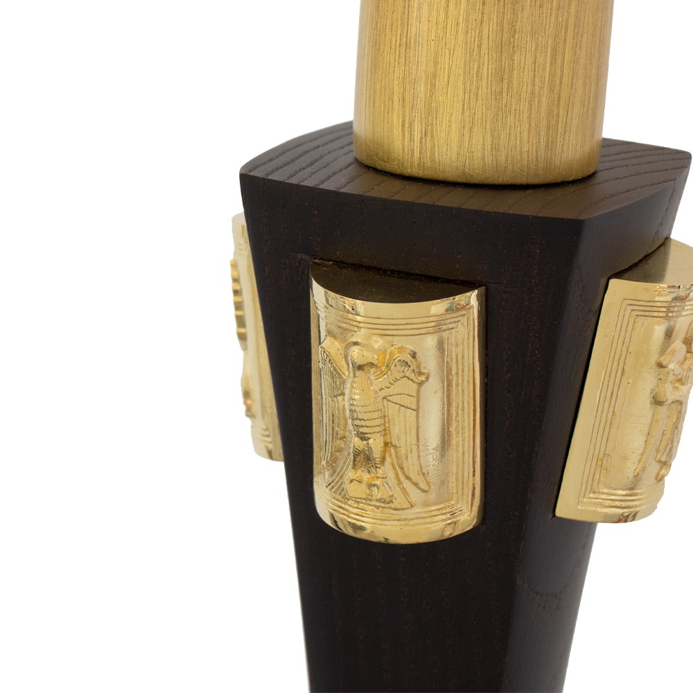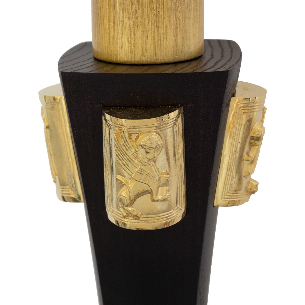 The crook is made of carved beech wood sheets of 2.5 mm using the cross-cutting technique. The gilding is in gold leaf (copper and zinc alloy). The surface was streaked in a later moment using the spreading technique. The node was shaped using 5-axis lathes with numerical control. The staff and the lower extremity are covered in polyurethane paint.
