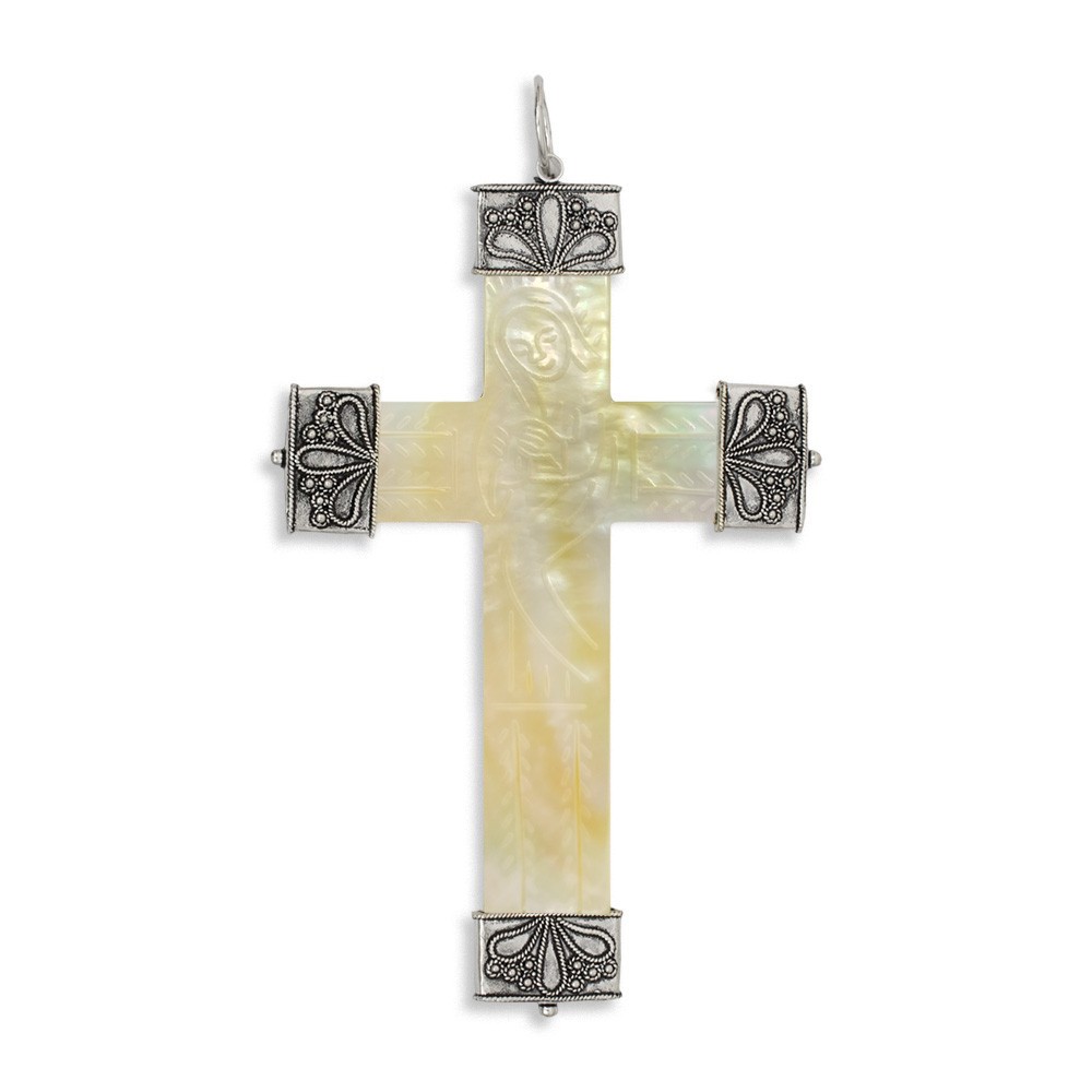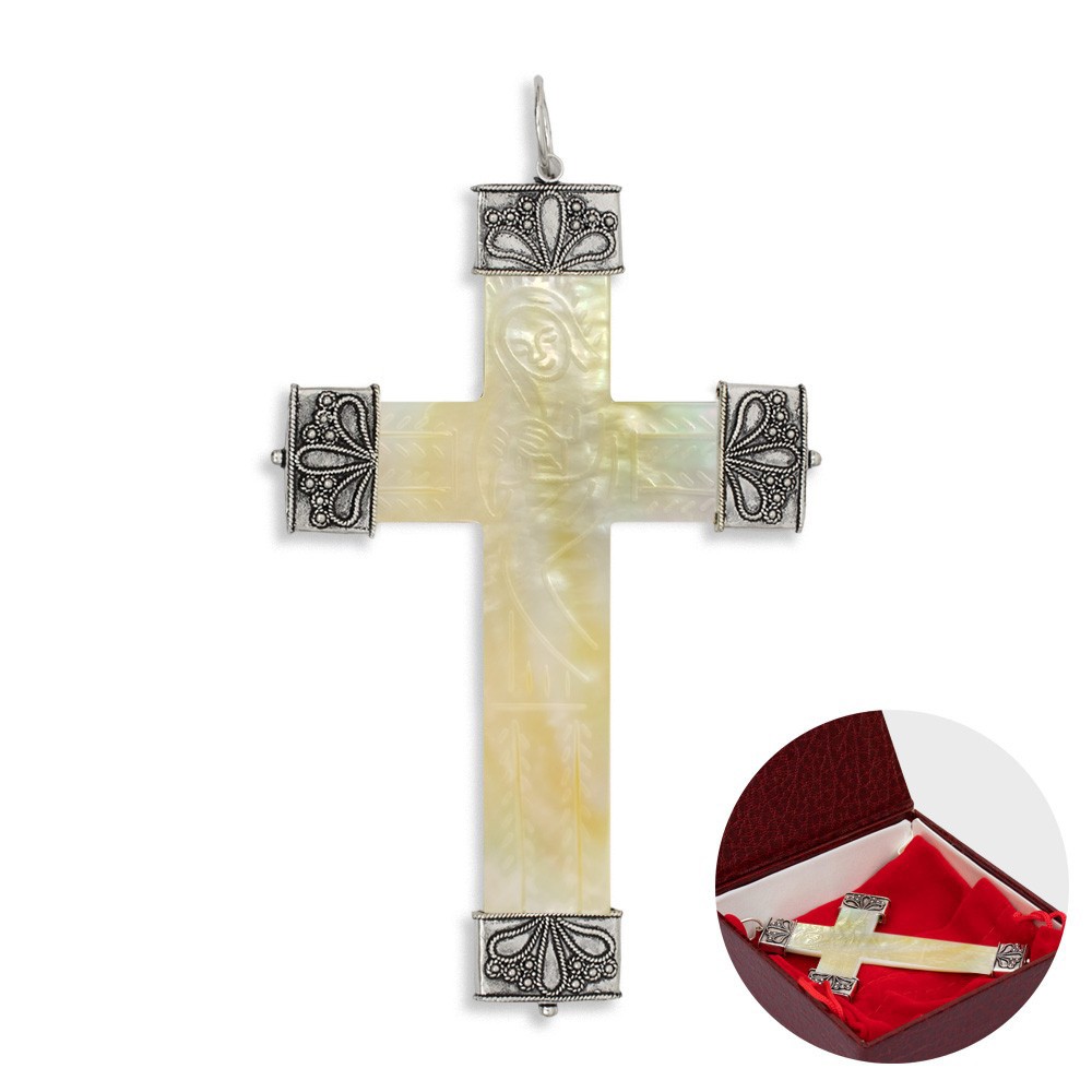 This pectoral cross is entirely made of mother of pearl with inlays in 925 silver, decorated with image of Our Lady in prayer.