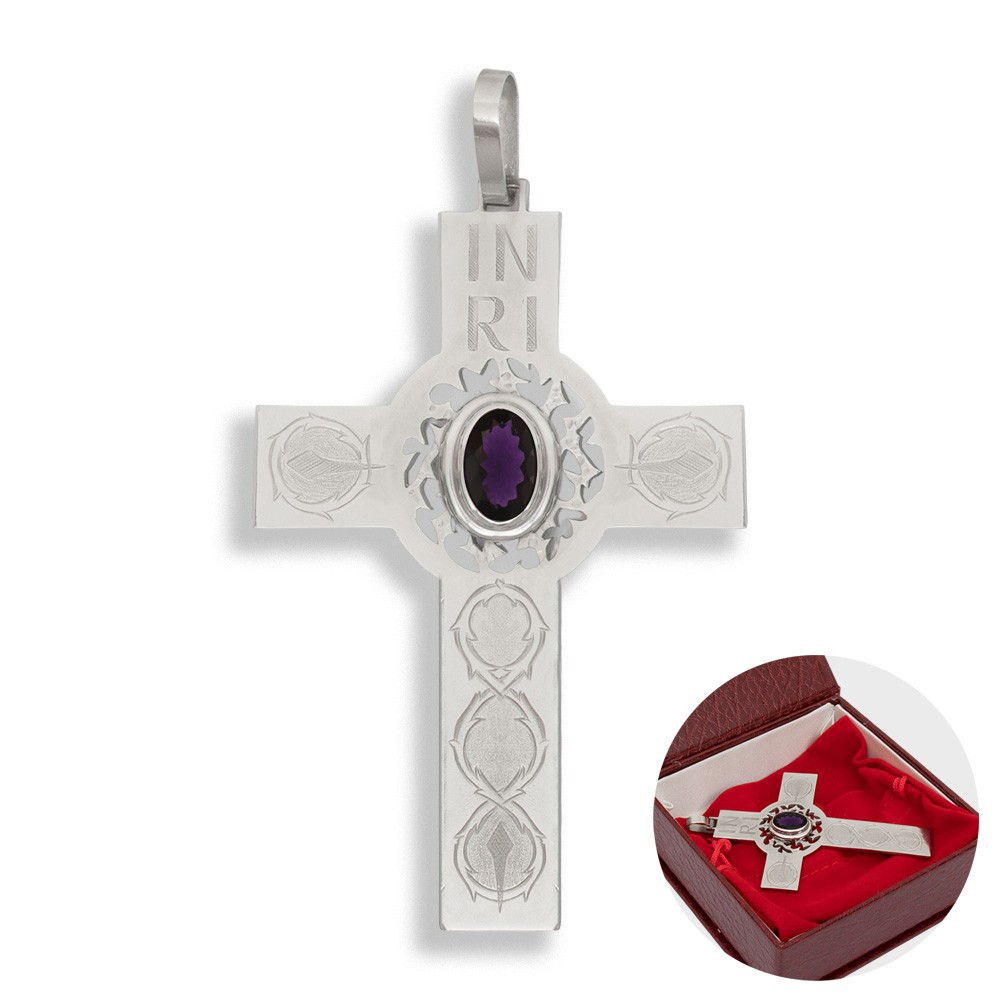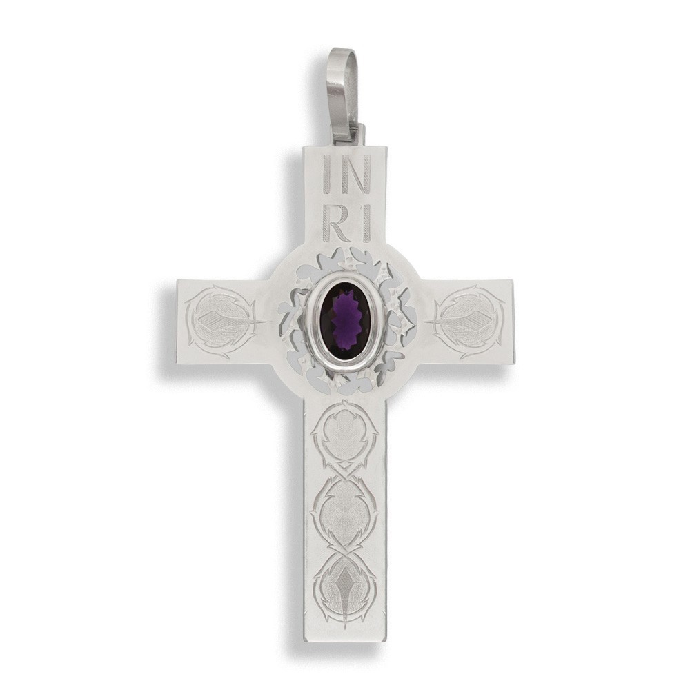 This lovely jewel is finely engraved with INRI inscription, crown of thorns and nails; enriched with a sophisticated amethyst stone.