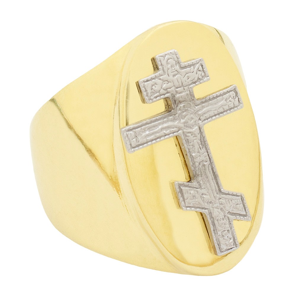 Bishop ring in gold-plated silver with orthodox cross of silver color.